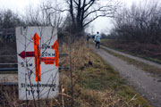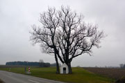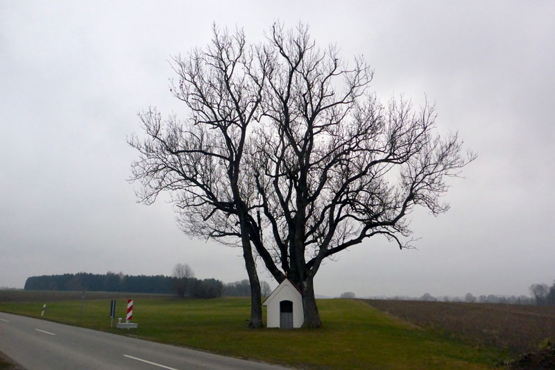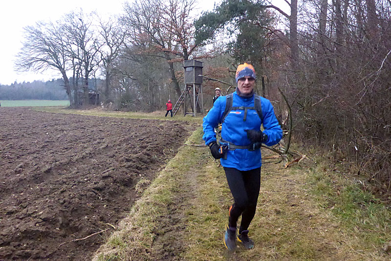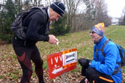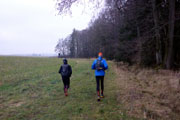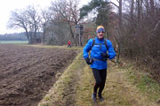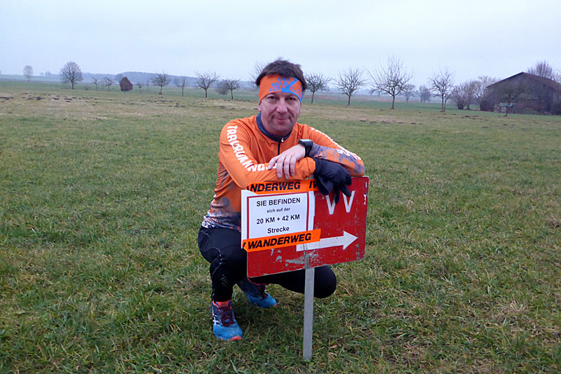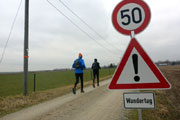Nassenhausen war auch gleich durchlaufen und außerorts erreichten wir auf einem Feldweg die zweite Kontrollstelle. Nachdem wir unseren Stempel auf der Karte hatten, liefen wir eine kleine Schleife zurück nach Nassenhausen. Wir kamen wieder an der Kirche vorbei und liefen erneut auf die Kontrollstelle zu. Halt, hier stimmt etwas nicht. Wir waren nun etwas verunsichert. Wenn wir weiterlaufen, kommen wir wieder an die Kontrollstelle und dann wieder zurück nach Nassenhausen. Wir mussten also eine Abzweigung übersehen haben, das war uns schnell klar. Nur was war nun sinnvoller? Die kleine Schleife nochmals zu laufen oder umzudrehen. Ich war für nochmals laufen und Bernie für's umdrehen. Gut, Bernie ist der ältere, also drehen wir um. Schon nach wenigen hundert Metern hatten wir die Abzweigung gefunden. Am alten Sägewerk ging's weg. Die Markierung hatten wir beim Ratschen schlichtweg übersehen. Na gut, nachdem die Strecke in diesem Jahr eh nicht ganz 42,2 Kilometer hat, sind wir halt ein paar extra Meter gelaufen und werden so wenigstens die Marathondistanz vollmachen.