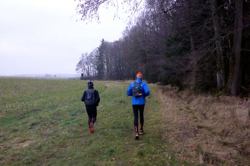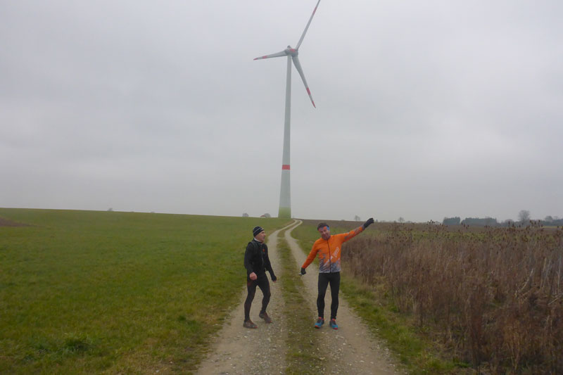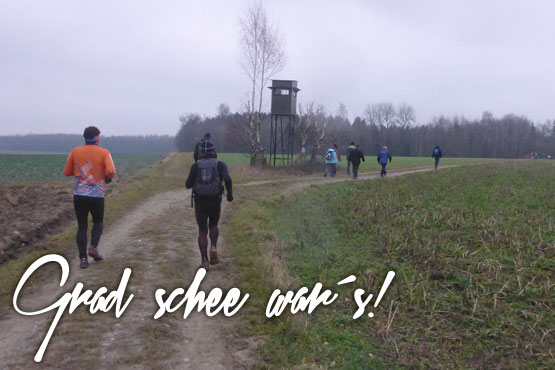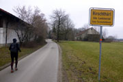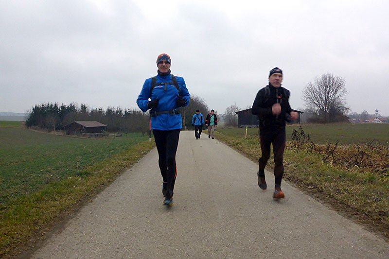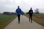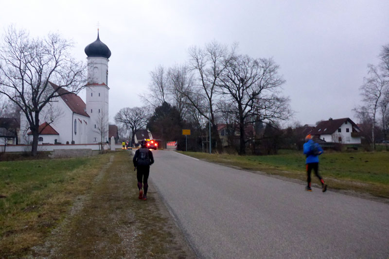 Schon nach wenigen hundert Metern haben wir Hattenhofen hinter uns und wir laufen in Richtung Haspelmoor. Wir freuen uns schon auf die bizarre Landschaft des Moors und hoffen auf einen schönen Sonnenaufgang. Ein paar Lücken sind zwischen den Wolken jedenfalls erkennbar. Doch unsere Hoffnungen auf das Moor werden in Haspelmoor jäh gebremst. Es geht durch die Bahnunterführung auf die südliche Seite der Bahnlinie München-Augsburg. Das Moor, das wir immer durchlaufen hatten, lag jedoch auf der anderen Seite. Auch wenn Bernie noch von einer neuen Schleife durch das Moor träumte, musste ich ihm den Glauben daran jedoch nehmen. Es gibt keinen anderen Weg zurück zum Moor. Aus noch nicht verständlichen Gründen war das Moor in diesem Jahr wohl nicht Teil des Wintermarathons. Etwas enttäuscht, den eigentlich schönsten Teil der Strecke nicht erleben zu können, liefen wir weiter.