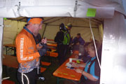 Unser nächstes Ziel war Adelshofen. Dort freuten wir schon auf eine ganz besondere Kontrollstelle. Dort wartet Peter Eckstein mit seinen Kumpels stets im Wohnzimmer auf uns, unterbricht sein Kartenspiel, um uns den Kontrollstempel auf die Karte zu drücken. Doch als wir uns seinem Haus nähern, sehen wir schon wieder eine kleine Veränderung. Ein Partyzelt ist vor der Garage aufgebaut, dort gibt's dieses Mal unsere Stempel. „Hast Du Dein Wohnzimmer nicht aufgeräumt? Oder warum dürfen wir nicht rein?“, witzle ich noch kurz mit Peter. „Doch, doch! Aufgeräumt ist schon. Aber heuer sind's zu viele Wanderer. Die passen nicht rein. Drum ham's mir ein Zelt hingestellt!“, erklärt Peter und wir verabschieden uns auch schnell wieder bis zum nächsten Mal.