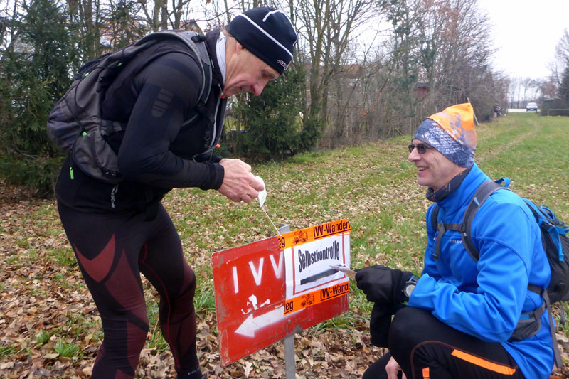 Schon nach wenigen Kilometern erreichten wir in einem Waldstück die erste Verpflegungs- bzw. Kontrollstelle. Wir gönnten uns einen Becher heißen Tee und holten unseren ersten Stempel auf der Kontrollkarte ab. Bernie fragte natürlich nach, warum das Haspelmoor dieses Mal ausgelassen wurde. Uns wurde erklärt, dass es sich beim Haspelmoor um einen Staatsforst handelt. Dort findet an diesem Tag eine schon lange angesetzte Treibjagd statt und gegen diese hatten die Naturwanderfreunde natürlich keine Chance. Man versprach uns aber, dass alles darangesetzt wird, dass das Moor beim nächsten Mal wieder durchlaufen werden darf. Dafür hatten wir natürlich Verständnis und machten uns auf den Weg nach Nassenhausen.