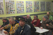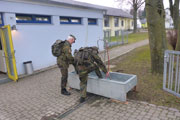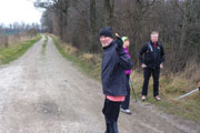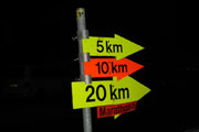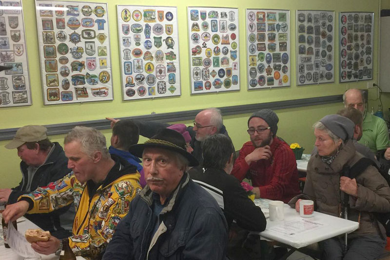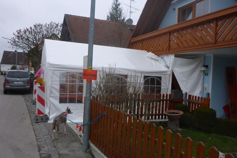 Nach 15 km erreichen wir Mammendorf, die dortige Kontrollstelle ist eine der komfortabelsten im ganzen Lande, angeblich unter Wanderern weithin bekannt und in einer mollig warmen Garage untergebracht. Die Seitenwände der Garage sind komplett zugepflastert von Wander-Trophäen in Form von Aufnähern. Gemütlich ist es hier, daher sind wohl auch alle Plätze belegt, aber im Vorzelt gibt’s für uns noch Platz. Gegen Bares gibt es Brotzeiten aller Art. Für zwei Becher, wieder superheißen Tees brauchen wir einige Minuten, zudem haben wir es ja nicht eilig. Dann hat die Gemütlichkeit ihr Ende, da isser schon wieder: unser gelbes Feinbild. Auf geht’s pack mers wieder, lautet schlagartig unsere Devise. Unverzüglich machen wir uns auf die Socken.
