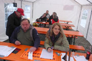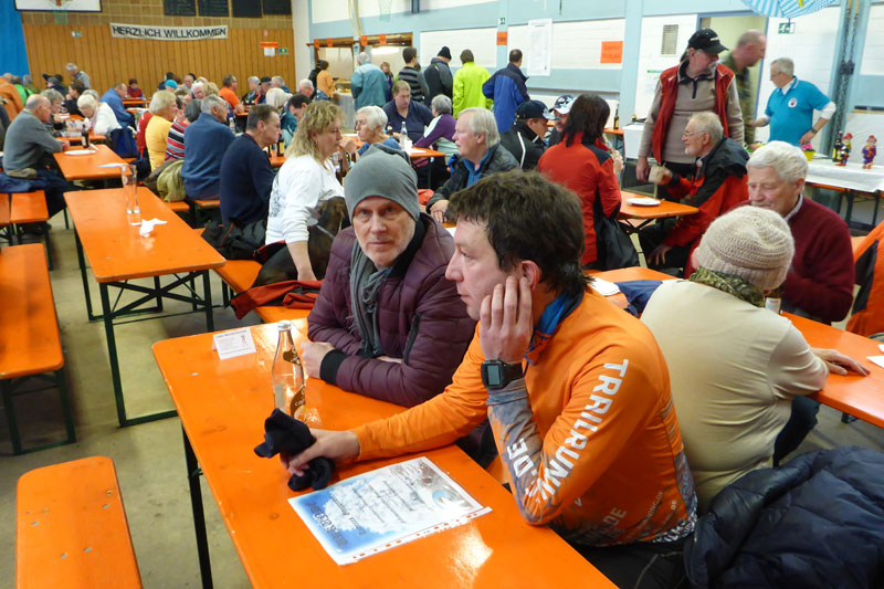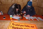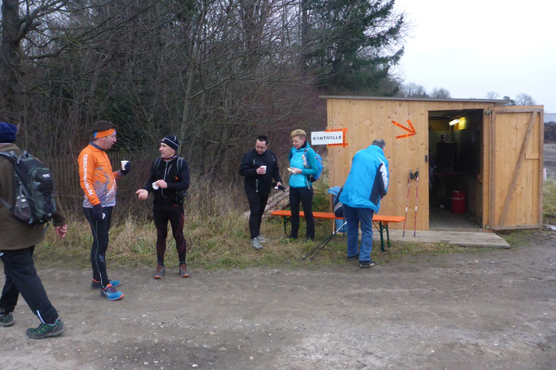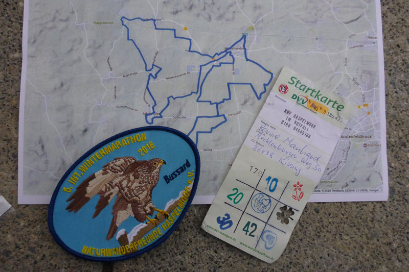 Für läppische € 7,50 erwerben wir unsere Startkarten, dafür bekommen wir eine ausgeschilderte Strecke, an den meisten Kontrollstellen warme Getränke und im Ziel noch eine Urkunde und einen Aufnäher anstatt Medaille. Die erworbene Startkarte ist auf der Strecke mitzuführen und muss an den Kontrollstellen abgestempelt werden. Natürlich bekommt im Ziel nur derjenige auch die Auszeichnungen, wer alle 9 Kontrollstempel vorweisen kann.