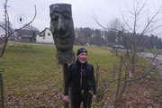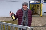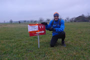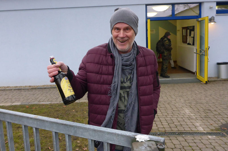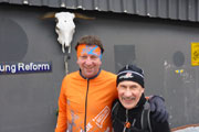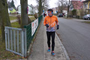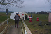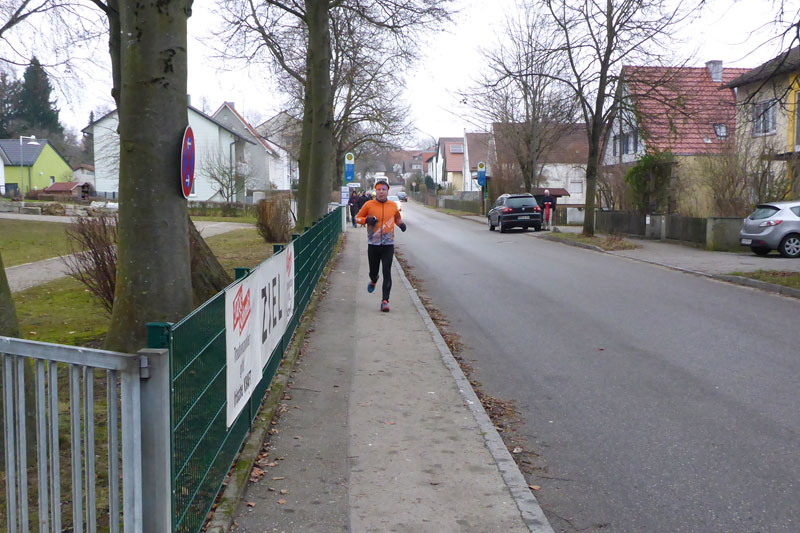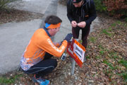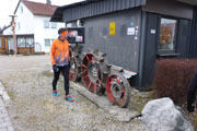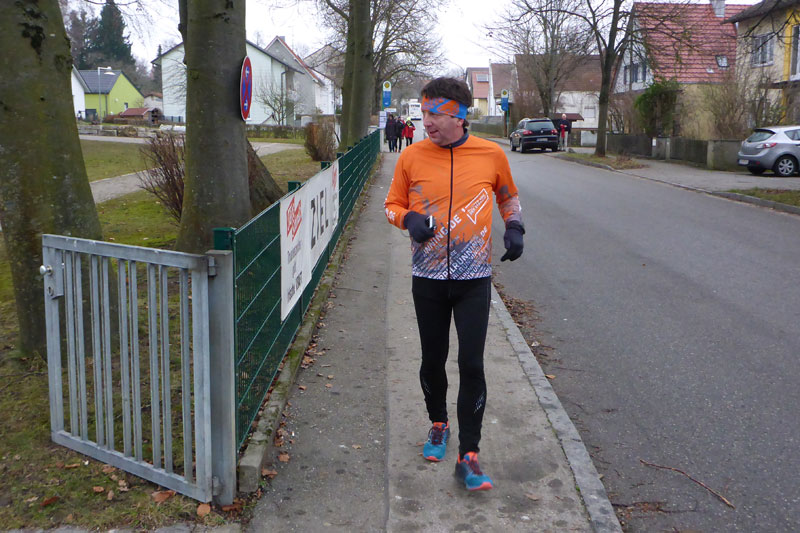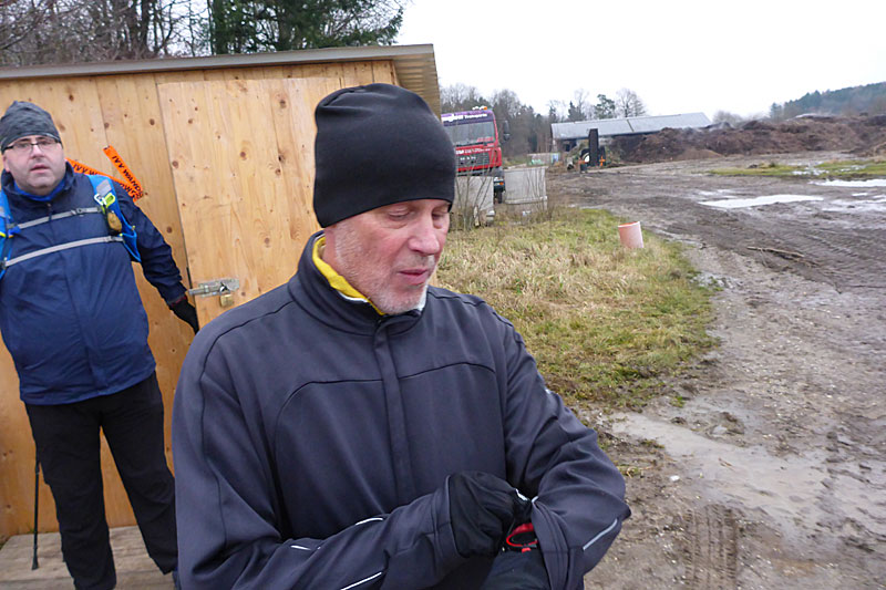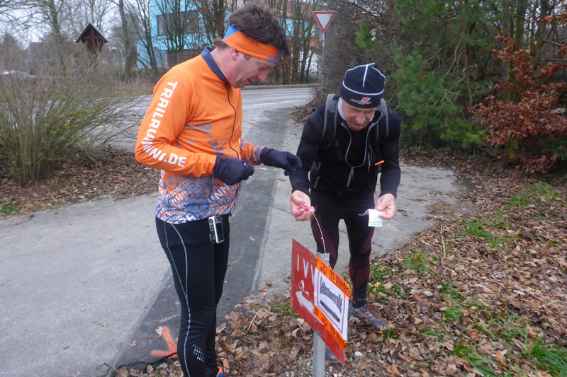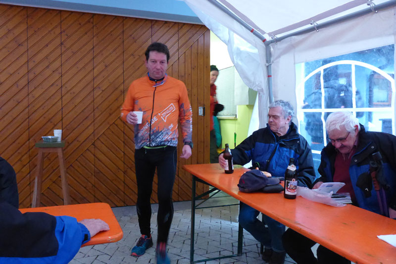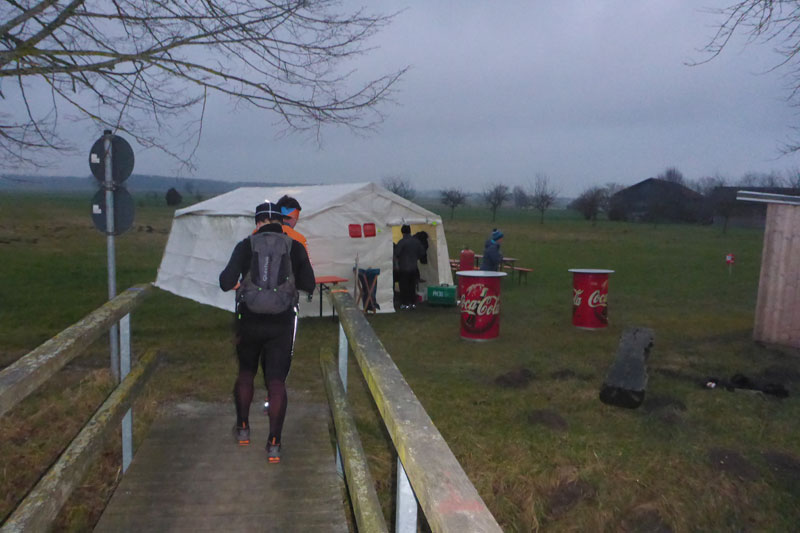 Immer wieder können wir uns an diverse Abschnitte der Strecke erinnern, aber in ganz anderer Reihenfolge wie vor zwei Jahren. In Adelshofen (km 9,4) erreichen wir die Kontrollstelle von Peter Eckstein. Den Stempel bekommen man normalerweise mitten in seinem Wohnzimmer, aber heuer sind zu viele Starter auf der Strecke, erzählt er uns, so hat man ihm ein beheiztes Zelt vor den Eingang gestellt. Heute am Samstag sind alleine etwa 270 Marathonis am Start, ohne die kürzeren Strecken.