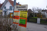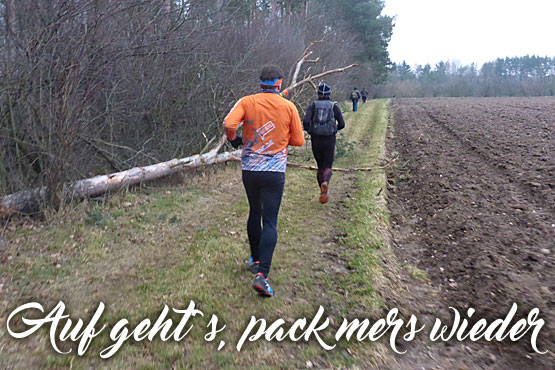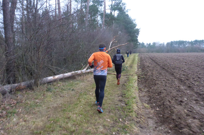 Eine Schleife führt uns nach Nassenhausen zurück, wo wir auch prompt die richtigen Markierungen übersehen und uns nochmals auf dieselbe Runde zur Kontrollstelle begeben. Nach 300 Metern kommt mir das aber doch etwas spanisch vor. Nach kurzer Beratung beschließen wir wieder umzukehren und entdecken auch bald die richtigen Hinweiszeichen. Einige der Wanderer sind so an uns wieder vorbeigezogen, was uns natürlich fuchst. U. a. auch der „Gelbe“ bereits zum zweiten Mal, da er im Gegensatz zu uns an den Kontrollstellen nichts trinkt. „Den merken wir uns“. So haben wir jetzt unser Feindbild, was uns zum Laufspaß auch noch etwas an zusätzlicher Motivation einbringt. Die Zusatzstrecke kostet uns aber doch einige Zeit, bis wir ihn uns wieder schnappen können.