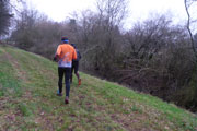 Um 7:50 Uhr gehen wir auf die Strecke, vor zwei Jahren konnten wir in einen traumhaften Sonnenaufgang laufen, heute herrscht Hochnebel und so ist es noch ziemlich düster. Charly nimmt die Sache etwas ernster als wir und macht sich vom Start weg gleich vom Acker und ist bald nicht mehr zu sehen. Für mich ist das nix. Nach einer schwierigen Saison mit insgesamt 5 Monaten Verletzungspause mit Wadenproblemen bin ich erst seit drei Wochen wieder im Lauftraining. 3 DNS, 4 DNF und nur 5 Finishe auf der Langstrecke sind meine Saisonbilanz 2017, das soll heuer natürlich wieder deutlich besser werden. A bisserl zwicken die Waden immer noch, daher werde ich vorsichtig angehen und zwischendrin auch immer mal wandern. Für 42 Laufkilometer reicht mein Trainingszustand bei weitem nicht, aber dafür ist der IVV-Marathon ja geradezu prädestiniert.