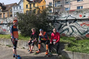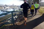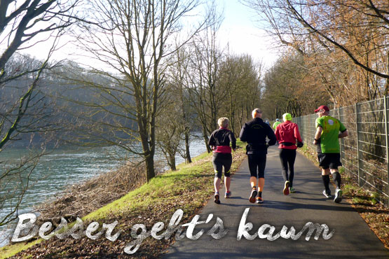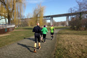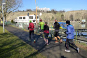 Die Strecke ist schnell erklärt. Wir laufen auf der östlichen Neckarseite in Richtung Norden, überqueren den Neckar bei Kilometer fünf und laufen auf der westlichen Seite wieder zurück. Bei Kilometer neun geht`s wieder auf die östliche Seite und Richtung Start- und Zielbereich. Nun folgen wir dem Neckar in südlicher Richtung, überqueren ihn diesmal bei Kilometer 11, bevor wir ihn kurz vor Kilometer 16 nochmal überqueren und wieder zurück zum Wassersport-Center laufen. Dort ist bei Kilometer 21 die erste von zwei Runden beendet. Bernie und ich wollen heute die beiden Runden gemeinsam unter die Füße nehmen. Begleiten werden uns Kati und Axel.
