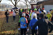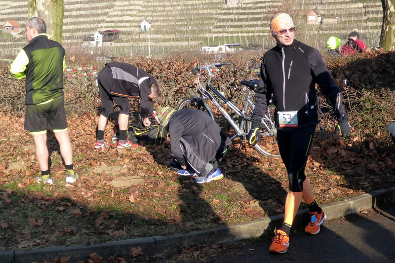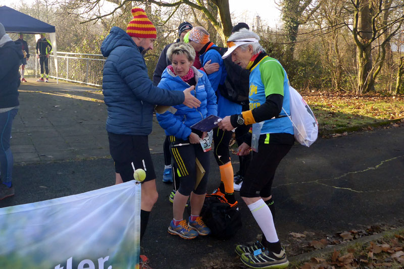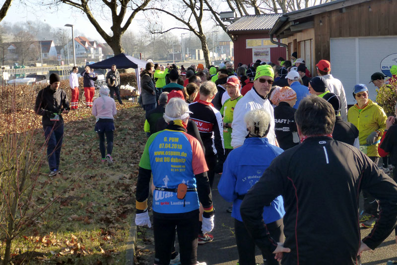 Heute bietet er uns ein besonders idyllisches Bild. Eine dicke Eisschicht bedeckt den See und er glitzert herrlich in der Morgensonne. Nur ein paar hundert Meter sind es am See entlang bis zum Wassersport-Center, wo die Startnummern ausgegeben werden. Bei unserem Eintreffen ist auch schon gut was los und wir müssen uns tatsächlich in einer kleinen Schlange anstellen, um unsere Startnummern abzuholen. Es geht aber sehr zügig und wir können schon jetzt einige Lauffreunde begrüßen. Neben den üblichen Verdächtigen aus dem baden-württembergischen Raum, sind auch einige weitgereiste mit dabei. Als ich meine Startnummer aus dem Umschlag ziehe, entdecke ich eine Neuerung beim Neckarufer-Marathon. Ein Zeitmess-Chip fällt mir in die Hände. Es gibt also erstmals auch eine Chipzeitmessung. Im vergangenen Jahr zog Michael mit einer Kreide noch den Start- und Zielstrich. In diesem Jahr liegt dort schon eine blaue Matte ausgerollt. Michael ruht sich also nicht auf seinem Erfolg aus, sondern verbessert auch noch kleine Details an der eh schon nahezu perfekten Organisation.
