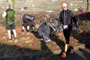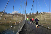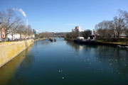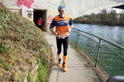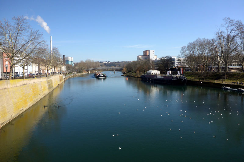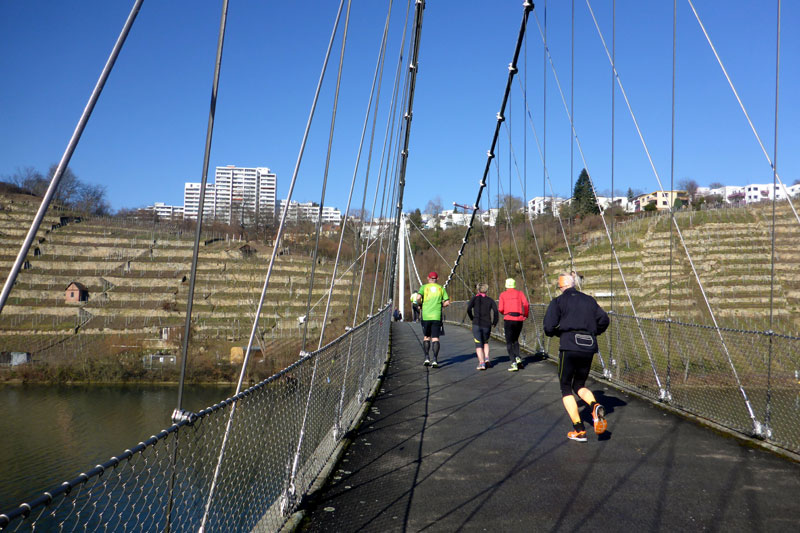 Der Rückweg auf der ersten Schleife führt uns an einem riesigen Klärwerk vorbei. Optisch nicht besonders schön, aber doch irgendwie interessant. Mein Blick geht jedoch die meiste Zeit in Richtung Neckar, so dass mich die teils nicht so schöne Bebauung rechterhand nicht sonderlich stört. Kurz nach Kilometer 8 treffe ich auf Sandra, die mir schon von weitem zujubelt. Ihr Mann Uli ist ebenfalls auf der Strecke und als ich näher komme, erkenne ich auch Uli selbst. Er labt sich hier an seiner persönlichen Verpflegungsstelle und gönnt sich eine erste kleine Pause. Ich schlage Sandras Angebot aus, als sie mich ebenfalls zu einem kleinen Snack einlädt. Bald erreichen wir den Vier-Burgen-Steg, überqueren diesen und haben schon gleich die erste Schleife bewältigt.