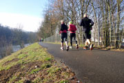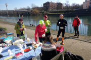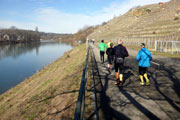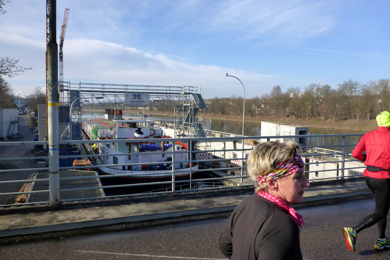 Ich bin gerade richtig warmgelaufen, als wir schon die Staustufe in Aldingen erreichen. Auf dem gewaltigen Wehr überqueren wir nun zum ersten Mal den Neckar und erreichen gleichzeitig die erste Verpflegungsstelle bei Kilometer 5. Die Helfer notieren nicht nur zur Kontrolle unsere Startnummer, sie bremsen auch den kaum nennenswerten Verkehr ein, da die Brücke nach wie vor für den Straßenverkehr freigegeben ist. Probleme bereitet dies jedoch zu keiner Zeit. Die Verpflegungsstelle gleicht einem Kuchenbuffet, doch für ein zweites Frühstück ist es mir noch zu früh. Ein flüchtiger Blick in die Becher zeigt mir, dass eigentlich nur Wasser angeboten wird. Da ich jedoch nicht gerade ein Wasserliebhaber bin, frage ich nach. Sekunden später halte ich eine Saftschorle in der Hand und bin zufrieden.