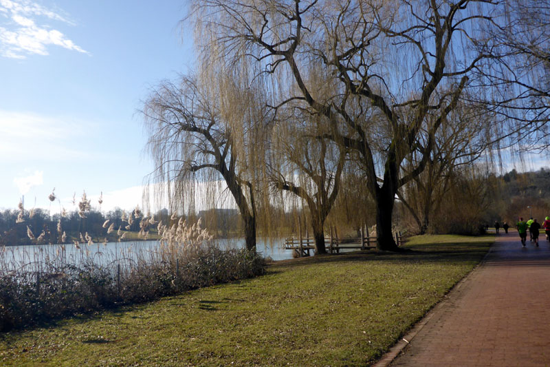 Die A 8 war erfreulich frei und der Nebel lichtete sich nach Augsburg etwas, so dass wir gut vorankamen und an einer pünktlichen Ankunft in Stuttgart nun auch keine Zweifel mehr bestanden. Je näher wir an Stuttgart kamen, um besser wurde auch das Wetter, so dass ich rund eine Stunde vor dem Start unter blauem Himmel auf dem Parkplatz am Max-Eyth-See einparken konnte. Erfreulich war für uns auch die Tatsache, dass es keinerlei Schnee zu sehen gab, vom dem haben wir nämlich alle drei die Nase inzwischen gestrichen voll.