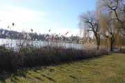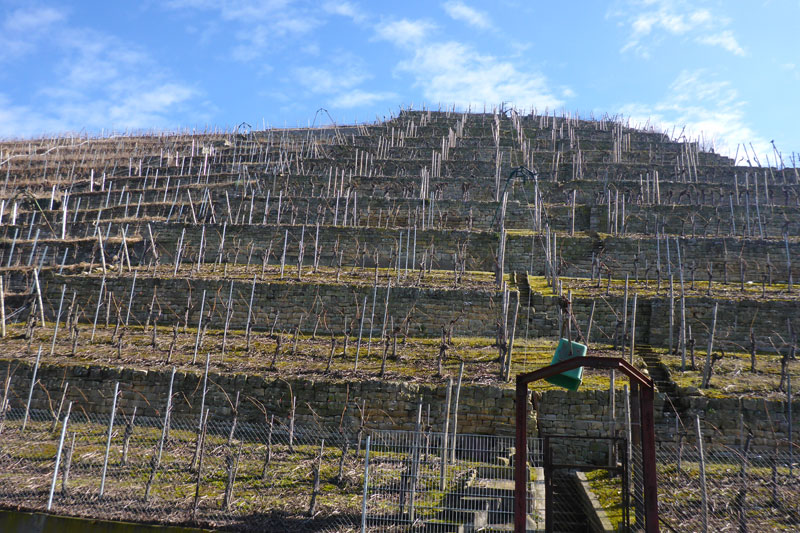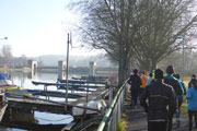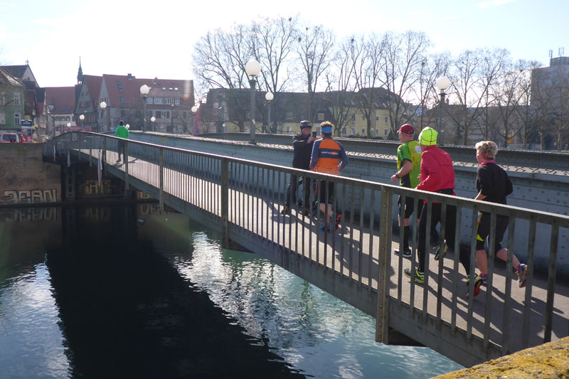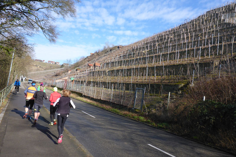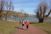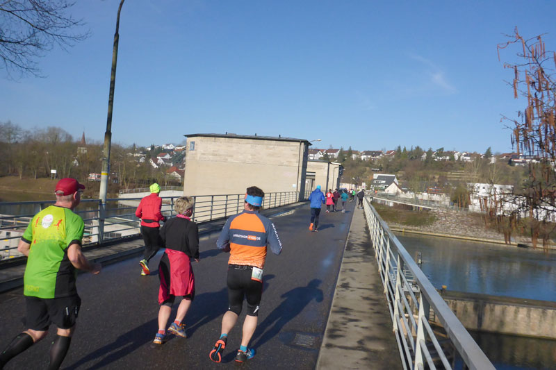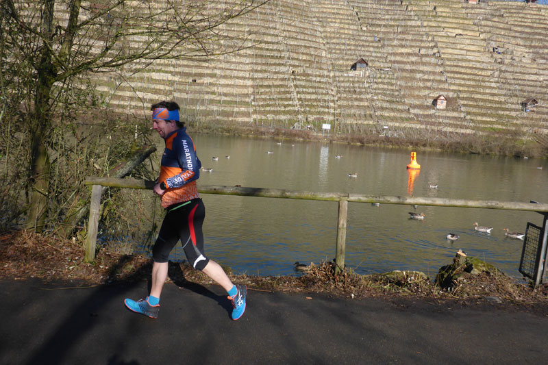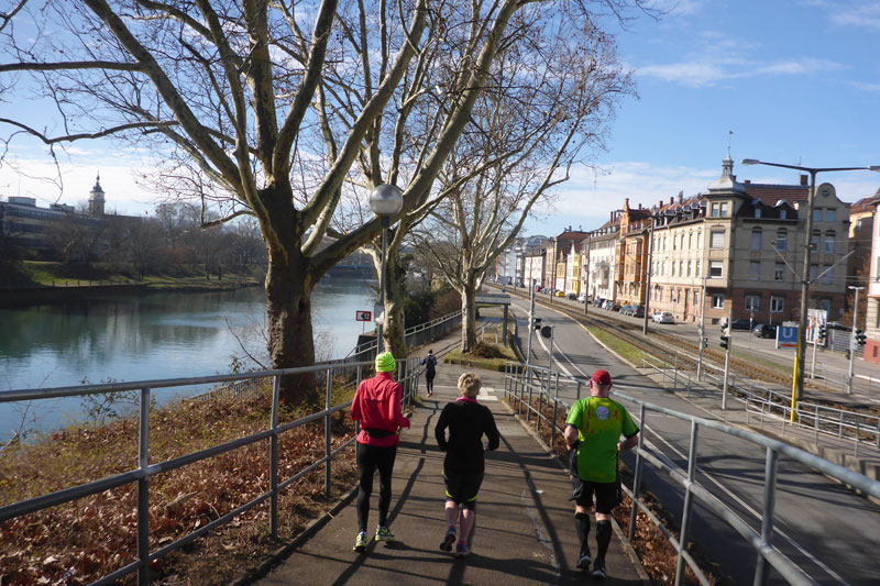 Ohne größere Höhepunkte geht es auf einem Radweg wieder zurück, die Ausblicke auf den Neckar sind aber sehr schön. Wir laufen auf dieser Seite bereits in der Sonne, was es noch angenehmer macht. Am Vier-Burgen-Steg wechseln wir wieder die Seite. Nach 10 km passieren wir wieder unseren Startplatz. Meine erste Schicht Wärmebekleidung verschwindet in der Tasche.