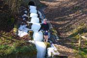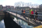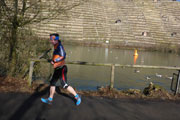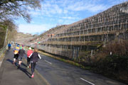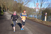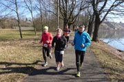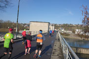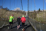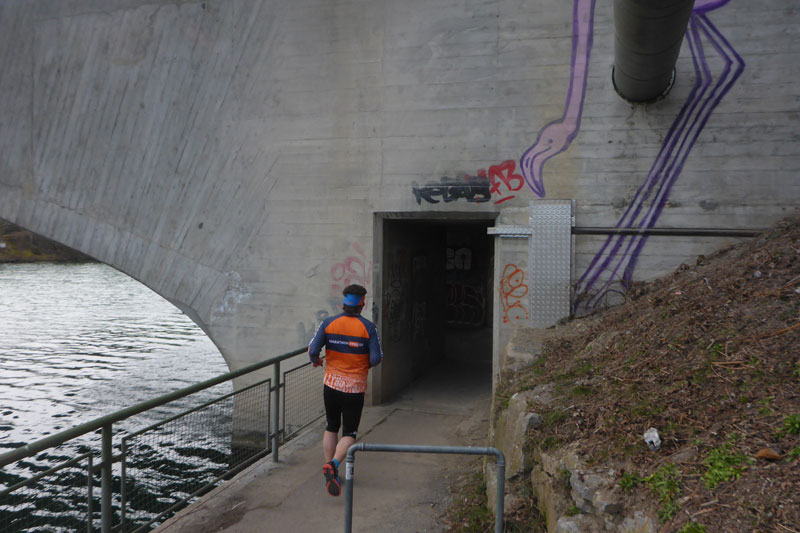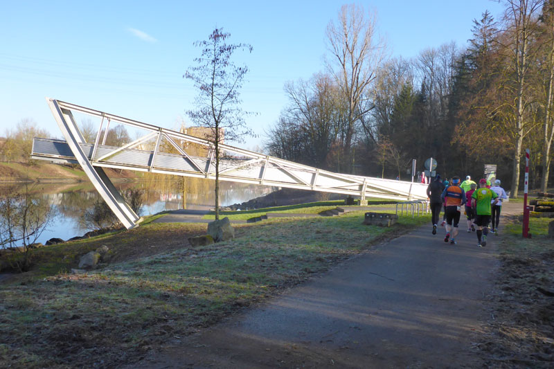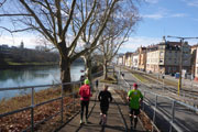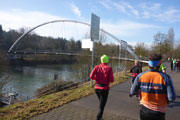 Die ersten Kilometer auf dem Radweg befinden sich um diese Uhrzeit noch im Schatten, so sind immer wieder Abschnitte noch leicht vereist und spiegelglatt. Da heißt es auf der Hut zu sein. Den Vier-Burgen-Steg erreichen wir nach einem Kilometer, etwa 8 km später werden wir hier von der gegenüberliegen Seite wieder herüber wechseln. Nach 3 km passieren wir die Fellbacher Landungsbrücke. Die Brücke ist eigentlich ein Kunstwerk, sie ragt nur ein paar Meter in das Wasser hinein und hört dann einfach auf. Man darf aber ausdrücklich hinauf, sie soll für den Besucher neue Ausblicke auf das hier renaturierte Flussufer schaffen. Sie ist Teil eines älteren Masterplans von 2007, für einen Landschaftspark Neckar. Am Uferweg gegenüber können schon die schnelleren Läufer beobachtet werden.