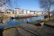 An der Schleuse Aldingen (km 5) wechseln wir die Neckarseite, über die Staustufe geht’s hinüber. Durch die Schiffsschleuse manövriert gerade ein größerer Pott. In Stuttgart wurde der Neckar ab den 1930er-Jahren kanalisiert und zur Bundeswasserstraße ausgebaut. Heute fließt er in einer für die Schifffahrt ausgelegten Fahrrinne aus Beton. Für uns ist hier die erste gut sortierte Verpflegungsstelle aufgebaut. Wer ein Stück Kuchen für ein zweites Frühstück bevorzugt, kann sich bedienen. Von einem Helfer wird die Startnummer nummeriert, damit alles seine Ordnung hat und keiner auf dumme Gedanken kommt.