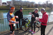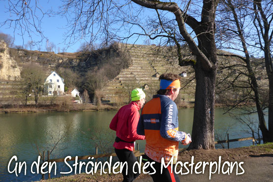 Nachdem Michael seine Startpistole geladen hat, schickt er uns mit leichter Verspätung um 9.02 Uhr auf die Strecke. Einige der (noch geplanten) Strände und Aktionen des Masterplans werden wir heute passieren. Die ersten 400 m geht es noch etwas eng, direkt an den Anlagen des Wassersportzentrums entlang. Nach unterqueren der Hofener Brücke befinden wir uns auf den Neckarradweg.