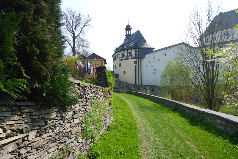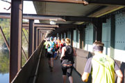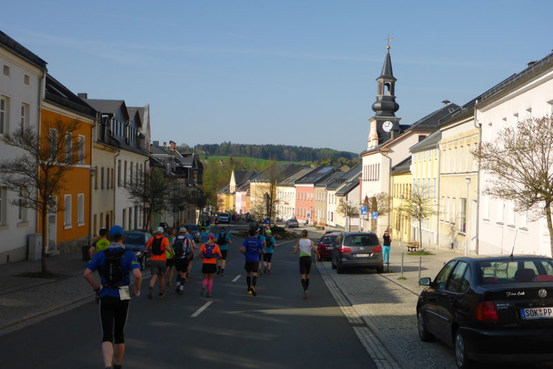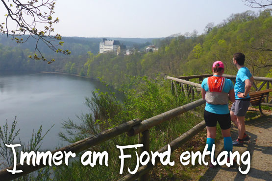 Durch die nett anzusehende Stadtmitte, am mittelalterlichen Rathaus vorbei, geht es leicht abfallend runter zur Stauseebrücke. Sie wird gerade saniert, die Straße führt nach Bad Lobenstein. Für Fußgänger und heute auch Läufer gibt es einen Ersatzsteg. Unten an der Schiffsanlegestelle liegt die Gera. „Ob Rund-, Kaffee-, Charter- oder Mondscheinfahrt bei uns schweben Sie auf der richtigen Welle“ lautet der Marketingspruch der Fahrgastschifffahrt Saalburg. Unmittelbar nach der Brücke geht es für uns nach rechts ans Ufer, wir dürfen jetzt auf unserer Welle surfen. Bis Kilometer 14 geht es immer wunderschön wellig direkt an der Uferkante entlang.