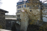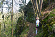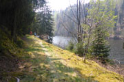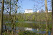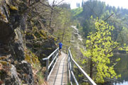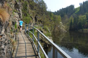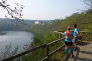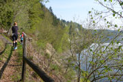 Ziemlich genau 5 km dauert der Waldabschnitt „ohne Wasser“. Nach einer längeren, sanften Abwärtspassage erreichen wir die Saale. Ein wunderschöner, leicht aufwärts führender Trail ist genau nach meinem Geschmack. An einer steilabfallenden Bergflanke geht es bis zur Talsperre Burgkhammer. Gegenüberliegend können wir Schloss Burgk über uns ausmachen.