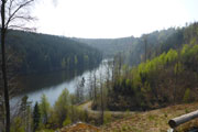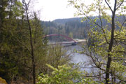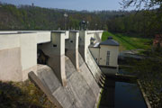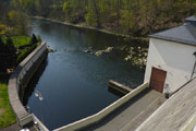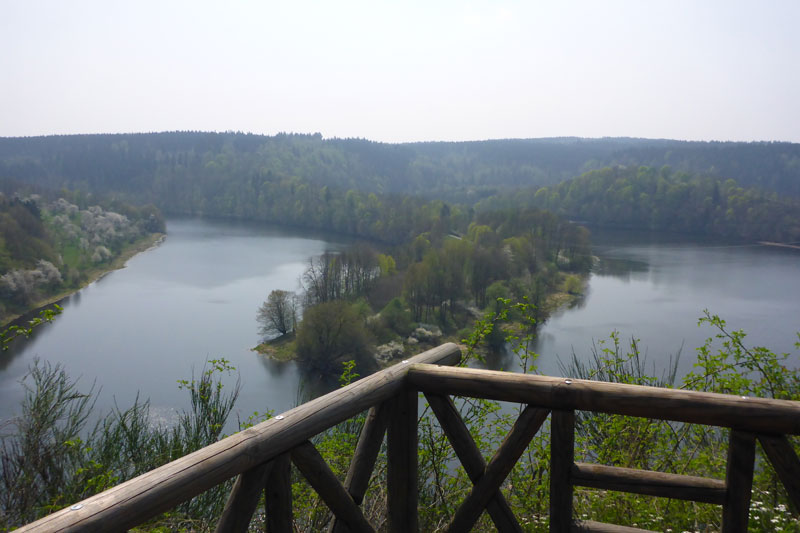 Über die 120 m lange und 75 m hohe Staumauer (km 21) wechseln wir wieder einmal die Flussseite. Die Talsperre Burgkhammer dient als Ausgleichsbecken für die große Bleilochtalsperre, die noch ein paar Kilometer weiter unterhalb liegt, die wir aber nicht direkt passieren. Namensgeber sind im Übrigen Bleilöcher, die sich vor der Anstauung dort befanden und in denen Blei abgebaut wurde. Die Talsperre Burgkhammer ist Teil der 80 km langen Saalekaskade die 6 Talsperren, 2 Pumpspeicherkraftwerke und 2 Laufwasserkraftwerke umfasst. Durch das starke Gefälle der Saale wurde dieses Talsperrensystem errichtet, was vorrangig zur Energieerzeugung genutzt wird.