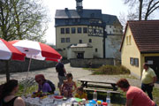 Um Punkt 9.00 Uhr fällt der Startschuss. Erstmal geht es auf dem geteerten Radweg nach Saalburg. Napoleon schaute hier in der Nähe schon mal auf ein Gefecht vorbei. Bekannt ist der Ort aber wegen seines Marmors. Das Saalburger Marmorwerk gehörte um 1900 zu den größten Marmorwerken Deutschlands. Mit dem Bau der Bleilochtalsperre zwischen 1926 und 1932 verschwand es aber im Wasser des Stausees. Gleichzeitig wurde ein neues Werk in der Nähe auf einem Hügel gebaut. Hier waren zu DDR-Zeiten über vierhundert Menschen beschäftigt. Marmorplatten aus Saalburg schmücken noch heute Fußböden und Wände von Palästen, Theatern, Kirchen, Opernhäusern oder Schlössern. Wir laufen am riesigen verfallenen Milchhof vorbei, ebenfalls ein Überbleibsel aus DDR-Zeiten.