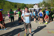 Nach einem kurzen Frühstück standen Kati und ich am nächsten Morgen schon zeitig vor dem Hotel, um nach weiteren Lauffreunden Ausschau zu halten. Frank Reichl war der erste, der mir in die Arme lief und auch Florian Kratz, wie gewohnt in Sandalen und Schottenrock gekleidet, gesellte sich bald zu uns. Mit Olaf Schmalfuss war unsere spaßige Truppe dann auch komplett. Es gab viel zu erzählen und zu lachen, aber irgendwann wurde es dann doch ernst und wir gesellten uns zu den anderen rund fünfzig Marathonis hinter den Starbogen. Kati scannte das Feld nach weiblichen Teilnehmern ab und musste schon genau schauen. Mit ihr waren es heute nur vier weitere, was ihr schon mal einen Platz in den Top Five sicherte. Nach unserem straffen Programm in den letzten Wochen hatten Kati und ich schon im Vorfeld ausgemacht, einen gemeinsamen, gemütlichen Trainingslauf zu absolvieren, auch wenn dies bedeuten sollte, dass wir als inoffizielle Besenläufer unterwegs sein würden.