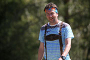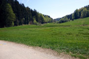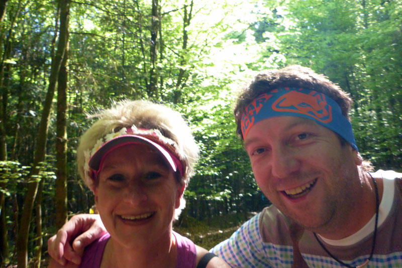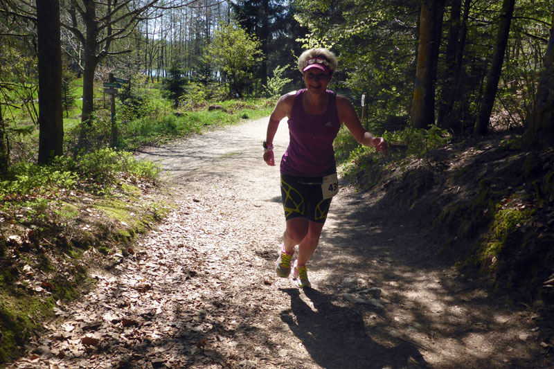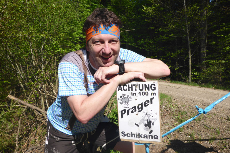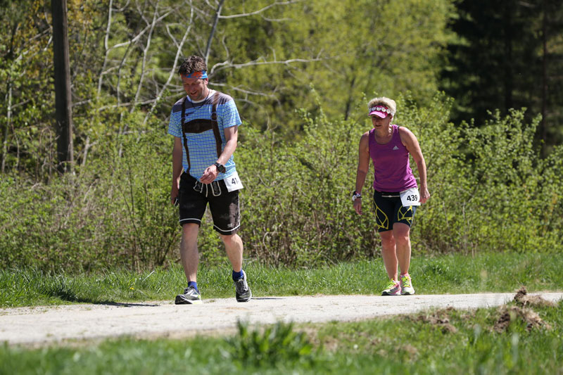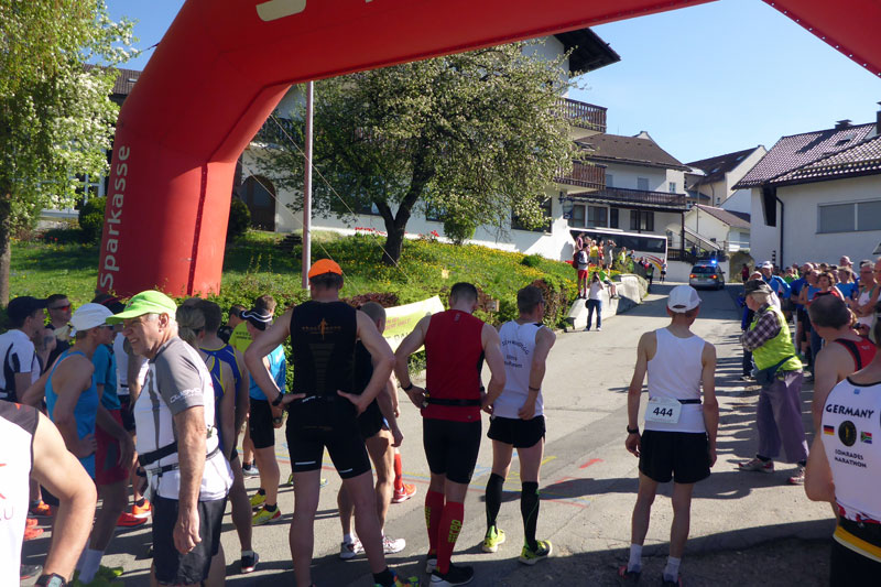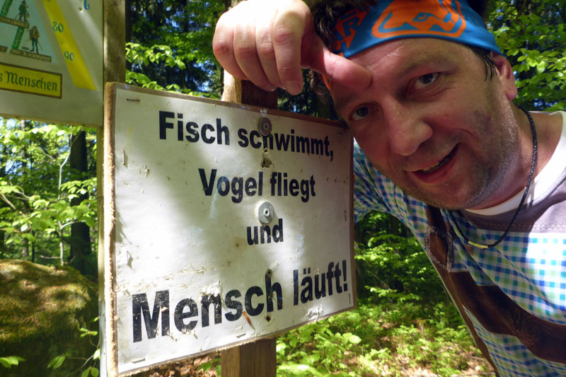 So ließen wir es auch langsam angehen. Kurz nach dem Start machte ich Kati noch auf Thurmansbangs Friseurladen, namens „MarHaarTon“ aufmerksam und schon kurz darauf lag der erste Anstieg vor uns, den wir gleich gehend bewältigten. Heute hieß es von Anfang an Körner zu sparen. Es war schon jetzt angenehm warm und würde im Laufe des Tages mit zu erwartenden Temperaturen von rund 28 Grad noch richtig heiß werden. Im Wald eingetaucht nahmen auch schon bald das lange Gefälle bis Kilometer 5 unter die Füße. Die Läufe der letzten Wochen machten sich jetzt schon etwas in den Oberschenkeln bemerkbar und wir wagten einen kurzen Blick nach hinten. Das Feld hinter uns war überschaubar. Wir ließen uns jedoch nicht aus der Ruhe bringen und nahmen nach der ersten Verpflegungsstelle auch gleich die „Prager Schikane“ in Angriff, nicht ohne, dass ich Kati von deren Bedeutung in Kenntnis setzte. In den letzten Jahren hat sich bei mir einiges an Wissen über Thurmansbang, dessen Umgebung und über den Marathon selbst angesammelt, das ich jetzt natürlich an den Mann bzw. an die Frau, in Form von Kati bringen musste.