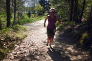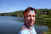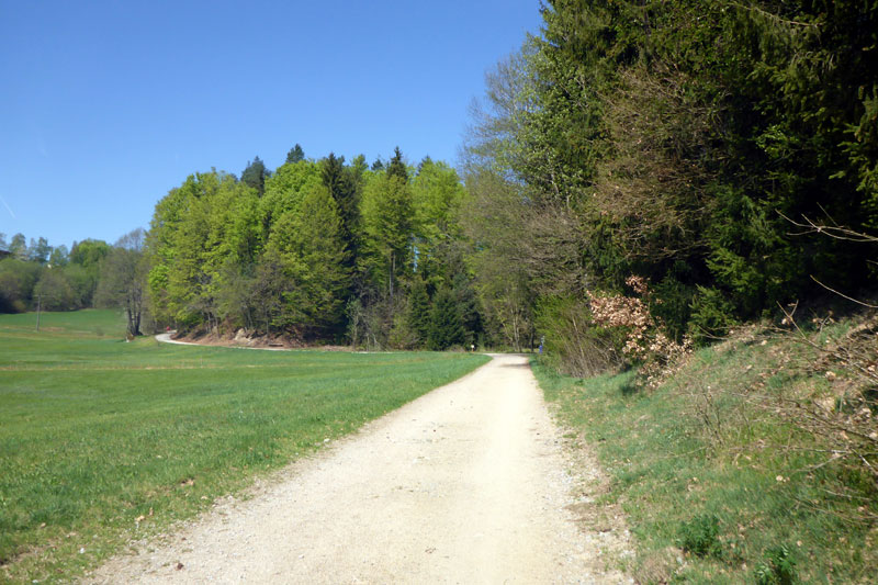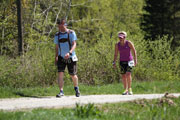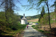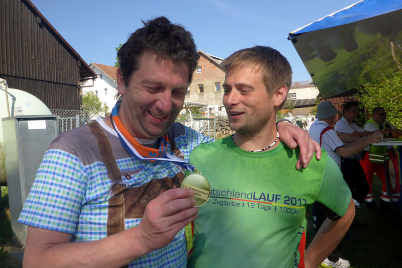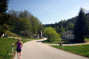 Danach geht`s kurz durch die Unterführung und der Dreiburgensee liegt vor uns. Wir umrunden ihn, erreichen die nächste Verpflegungsstation und weiter geht`s in Richtung Bründl Kapelle. Kati ist nun schon etwas müde und ich unterhalte sie weiter mit meinen Geschichten. Als ich ihr erkläre, dass das Wasser der Quelle an der Kapelle Augenleiden lindern soll, nimmt Kati gleich einen großen Schluck. Auf den kommenden rund vier Kilometern zurück nach Thurmansbang lassen wir nicht nur die Führenden des Halbmarathons, die eine Stunde nach uns gestartet sind, ziehen. Auch ein paar Marathonis finden immer wieder den Weg an uns vorbei.