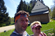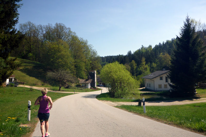 An den Anstiegen war ich gegenüber Kati immer leicht im Vorteil und wartete so gelegentlich bis sie wieder aufgeschlossen hatte. Auf den kommenden Kilometern gab es natürlich immer wieder Streckenabschnitte, die bei mir Erinnerungen an die vergangenen Teilnahmen hervorriefen und so kamen wir gut voran. Auch die eigentlich etwas zähe Strecke auf der Staatsstraße von Schadhamm, über Kollnberg und Thurmannsdorf nach Loderhof mit ihren zahlreichen langen Anstiegen brachten wir gut hinter uns. Ich warnte Kati jedoch schon vor der zweiten Runde. Dann scheint dieser Teil der Runde doch immer etwas länger zu werden. Bald ging es dann am Museumsdorf Bayerischer Wald vorbei und ich musste Kati natürlich auch von meinem „Blitzbesuch“ im Museum erzählen, als ich während des Marathons einfach, und natürlich ohne zu bezahlen, ins Gelände lief, um ein paar Fotos zu machen.