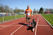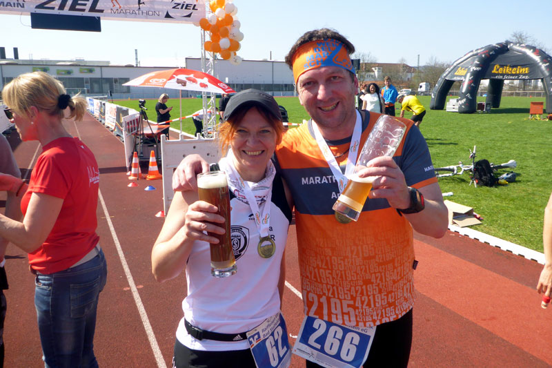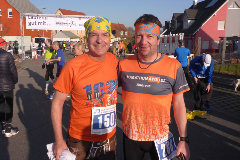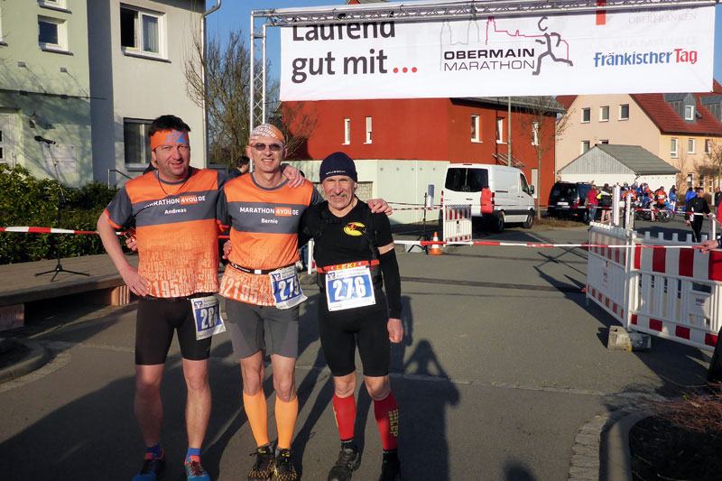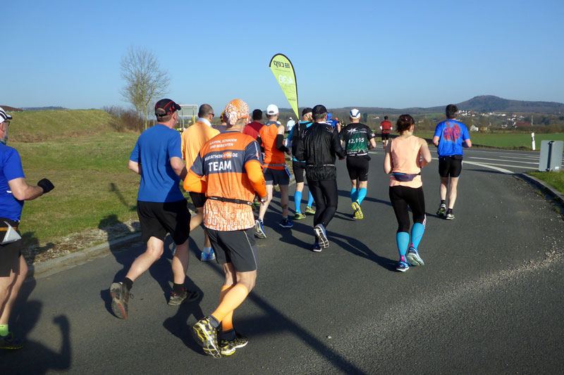 Am nächsten Morgen machten wir uns dann auf den Weg in die Bischof-von-Dinkel-Straße, wo pünktlich um halb Neun der Startschuss für die bereits 14. Auflage des Obermain-Marathons erfolgen sollte. Das Wetter war perfekt. Strahlend blauer Himmel und Temperaturen um die 7 Grad. Im Laufe des Tages sollten es noch über zwanzig Grad warm werden, so gab es über die Kleiderwahl keine Diskussion. Nach dem langen zähen Winter konnte man endlich wieder in kurzen Klamotten laufen. Am Start konnten wir auch noch den ein oder anderen Bekannten treffen und begrüßen, bevor es endlich losging. Rund 300 Marathonis waren gemeldet und so war am Start einiges los.