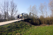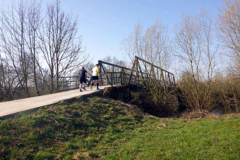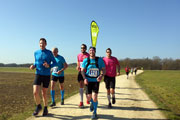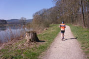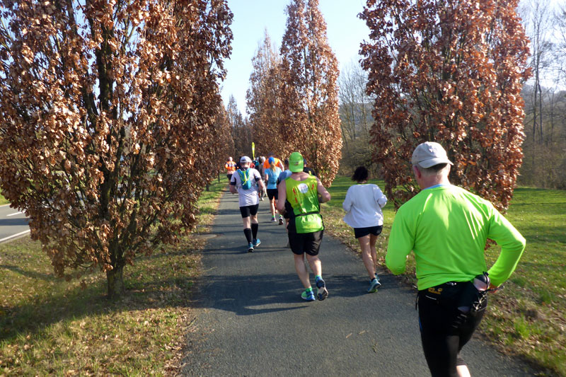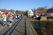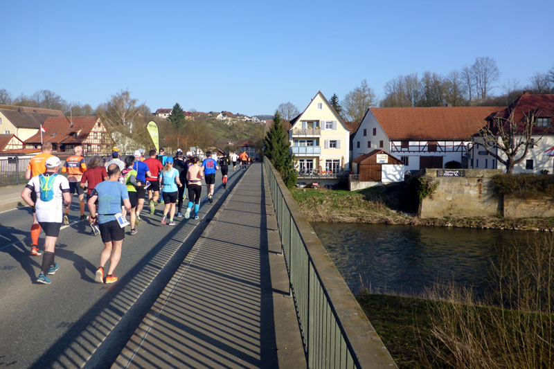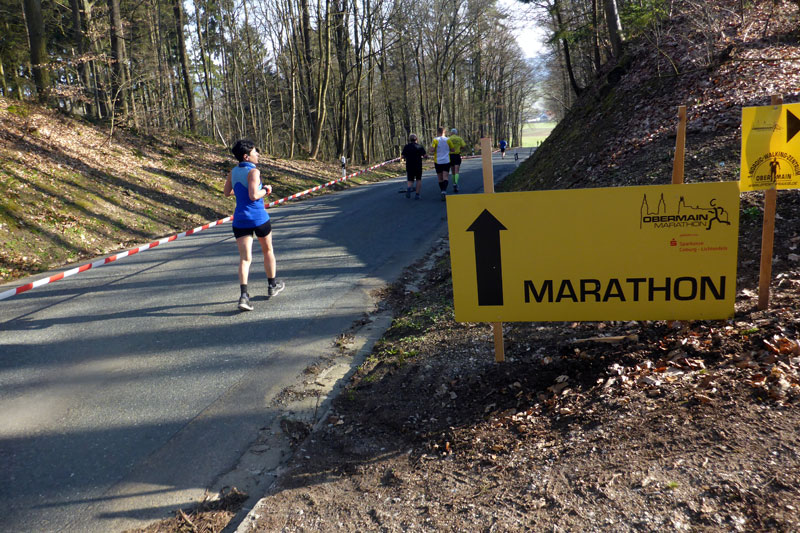 Flankiert wurden wir auf den ersten paar hundert Metern von zahlreichen Zuschauern unter denen sich auch bereits die Halbmarathonis befanden, die kurz nach uns auf die Strecke geschickt wurden. Jetzt galt es sich erst einmal warm zu laufen. Die Strecke schlängelte sich durch Bad Staffelstein, wo wir unweit des Bahnhofs durch die dortige Unterführung in die Natur entlassen wurden. Unser erstes Ziel hieß Unnersdorf, das wir nach 2 Kilometern erreichen sollten. Mein Blick glitt aber immer wieder nach rechts. Auf einer Anhöhe liegt das Kloster Banz, das erste Highlight des Marathons. Als wir Unnersdorf erreicht hatten und erstmals den Main überquerten, war ich bereits gut warmgelaufen. Das war jetzt auch gut so, denn am Ortsende bogen wir nach rechts ab und vor uns lag der Banzer Wald.