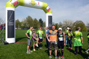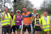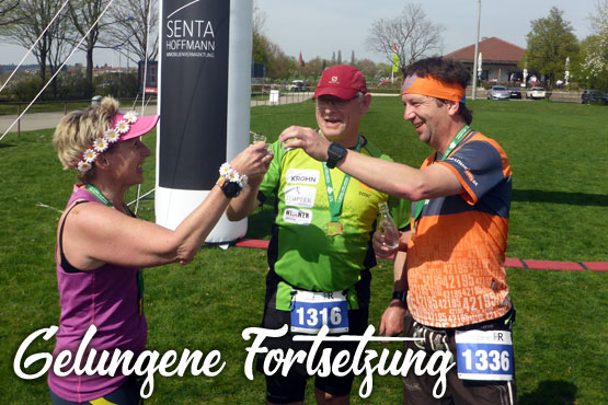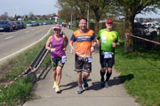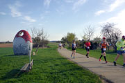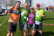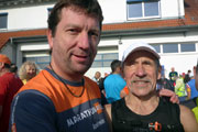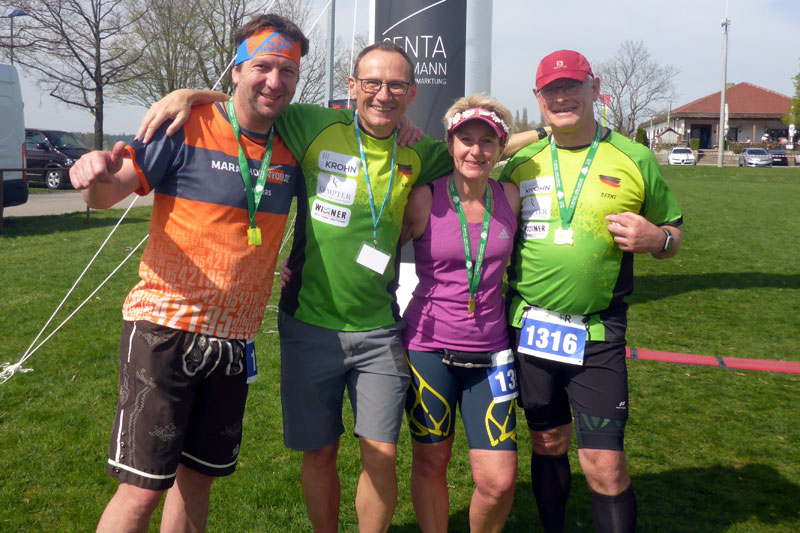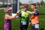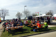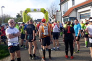 Am Tisch gegenüber bekam ich meine Startnummer für den Marathon und anschließend gönnten Jan und ich uns noch einen Kaffee in der Halle. Wir beobachteten das Treiben der zahlreichen freiwilligen Helfer, die gut an ihren, in der Laufszene inzwischen wohl gut bekannten grünen Laufshirts und Trainingsjacken, leicht zu erkennen waren. Es wurden Kuchen und Torten beigebracht, Pokale für die Siegerehrungen platziert, nach und nach füllte sich die Halle auch mit Läufern. Da Baden-Württemberg ja lauftechnisch schon so etwas wie eine zweite Heimat für mich ist, konnte ich zahlreiche Lauffreunde begrüßen. In einem kurzen Gespräch über die Organisation erklärte mir Kalle, dass am heutigen Tage rund 300 Helfer im Einsatz sind und die Mitglieder gut ausgelastet sind, weshalb die Teilnahmezahlen beim Marathon auf 200 Läufer und beim Halbmarathon auf weitere 400 beschränkt sind. Mehr traut man sich im Moment noch nicht zu, obwohl die Stecke wohl deutlich mehr Läufer aufnehmen könnte. Insgesamt werden es heute rund 1250 Teilnehmer sein, die in Bambini-Läufen, Walking-Wettbewerben und den Langstrecken an den Start begeben.