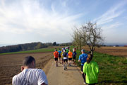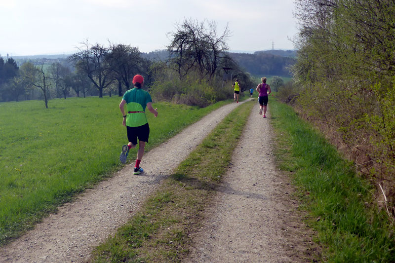 Die ersten zwei-, dreihundert Meter führen uns an zahlreichen Zuschauern raus aus Lichtenwald. Es geht erst mal eben dahin und wir laufen in Richtung Süden. In der Ferne kann man die Berge der Schwäbischen Alb erkennen, über uns trüben nur ein paar weiße Wölkchen den blauen Himmel. Immer wieder geht es nun am Anfang sachte bergab, bevor wir am Ende des Gehweges mit einem kurzen Schwenk nach rechts und gleich wieder nach links in den vor uns liegend Wald eintauchen. Nun haben wir einen breiten, gut zu laufenden Waldweg vor uns. Auf den ersten Kilometern geht es nun wirklich stetig bergab und man kann es so richtig schön laufen lassen. Das tut auch Jan. Er liebt Bergab-Passagen und so ist er schon bald aus meinem Blickfeld entschwunden. Man kann erkennen, dass der Wald nach dem langen kalten Winter auch gerade so richtig in Fahrt kommt. Einzelne Bäume sind zwar noch kahl, andere hingegen stehen bereits in voller Blütenpracht da und man erkennt, dass es nicht mehr lange dauern kann, bis der gesamte Wald wieder sein volles Laubkleid trägt. Ich genieße die Aussicht auf den Frühling und laufe Kilometer und Kilometer bergab. Bis Kilometer 5 sind wir so bald angekommen und erreichen kurz zuvor die erste Verpflegungsstation.