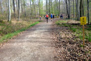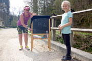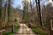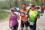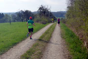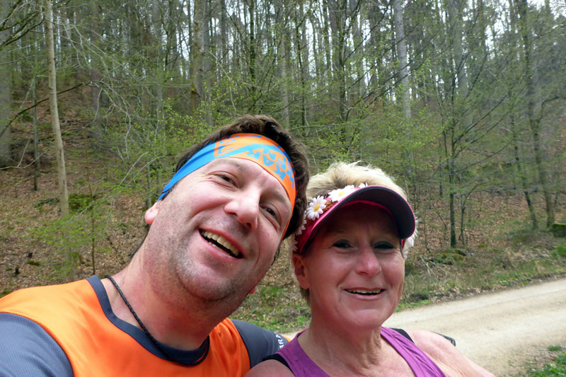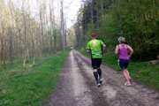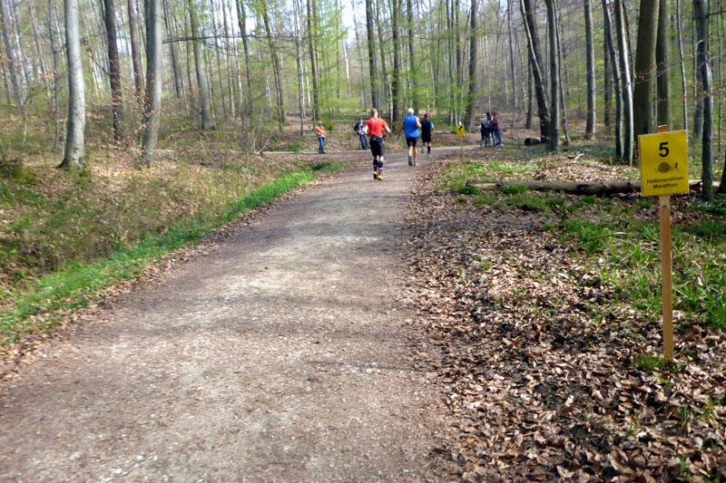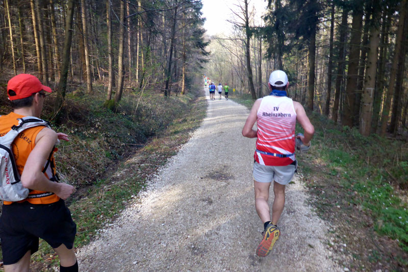 Die erste Hälfte des Marathons verläuft übrigens nahezu ausschließlich im Wald, was etwas überrascht. Schließlich leitet sich der Name Lichtenwald vom „lichten Wald“ ab, einer Bezeichnung, die schon im Jahr 1555 in alten Forstlagerbüchern des örtlichen Forstamtes zu finden war. Die Gemeinde Lichtenwald gibt es seit 1971 durch einen freiwilligen Zusammenschluss der bis dahin selbständigen Gemeinden Hegenlohe und Thomashardt. Mir macht das im Moment gar nichts aus. Ich genieße hier die frische Luft und das Laufen im Wald macht einfach Spaß. Auch auf den kommenden Kilometern durch den Wald wechseln sich Anstiege und Gefälle immer wieder ab. Ich schließe nun auch auf Kati und Bernie auf, die vor mir gerade wieder einmal bergauf in den Schlenderschritt verfallen sind. Irgendwann zieht Bernie von dannen und ich teile mir die weitere Strecke, wie schon so oft, mit Kati.