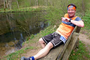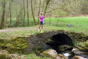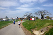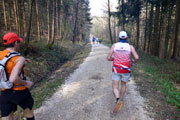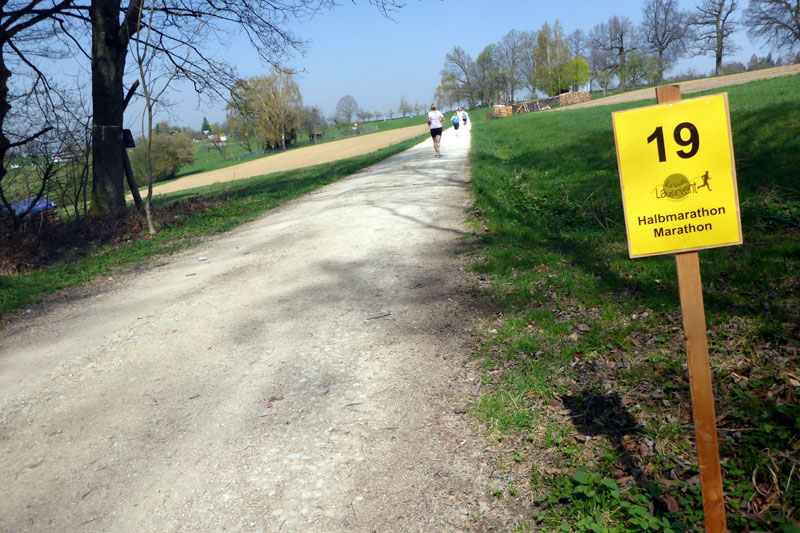 Mit dem Bergablaufen ist es jetzt erst mal passé. Anfangs geht es noch leicht wellig dahin und man kann alles gut laufen. Doch dann liegt ein langer zäher Anstieg vor uns. Ich kann mich an ihn noch gut erinnern. Eigentlich ist er zu flach, als dass man ihn wirklich gehend bewältigen muss, anderseits ist er zu kräftezehrend, als dass man ihn laufen will. Ich entscheide mich, dafür ihn mit Gehpausen zu laufen, wobei die Pausen immer länger werden. Ich will ja meine Körner nicht schon am Anfang verschießen, es liegt ja noch ein gutes Stück vor mir. Ab nun müssen wir uns auch immer wieder mal von den Halbmarathonis überholen lassen, die eine viertel Stunde nach uns gestartet sind. Ihre Strecke ist bis Kilometer 20 mit unserer identisch. In der Nähe von Ebersbach verlassen wir kurz den Wald und laufen zwischen sattgrünen Wiesen und blühenden Bäumen eine kurze Schleife auf einem Forstweg, bevor es erneut in den Wald zurück geht.
