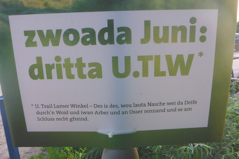 Nicht zu übersehen sind die vielen Plakate und großformatigen Banner sobald man sich im Umkreis des Lamer Winkels befindet. „Zwoada Juni: dritta U.TLW“ lautet der Slogan. „Des is des, wou lauta Nasche wie da Deifi durch’n Woid und iwan Arber und an Osser rennand und se am Schluss recht gfreind.“ Übersetzen werde ich euch das nicht, ihr sollt selber euren Spaß haben, aber so viel ist klar: Die Leut im „magischen U“ freuen sich auf die dritte Auflage des U.Trail Lamer Winkel. Ich bin auch zum dritten Mal dabei und freue mich ebenfalls recht sakrisch, weil ich ja schon weiß was mich erwartet.