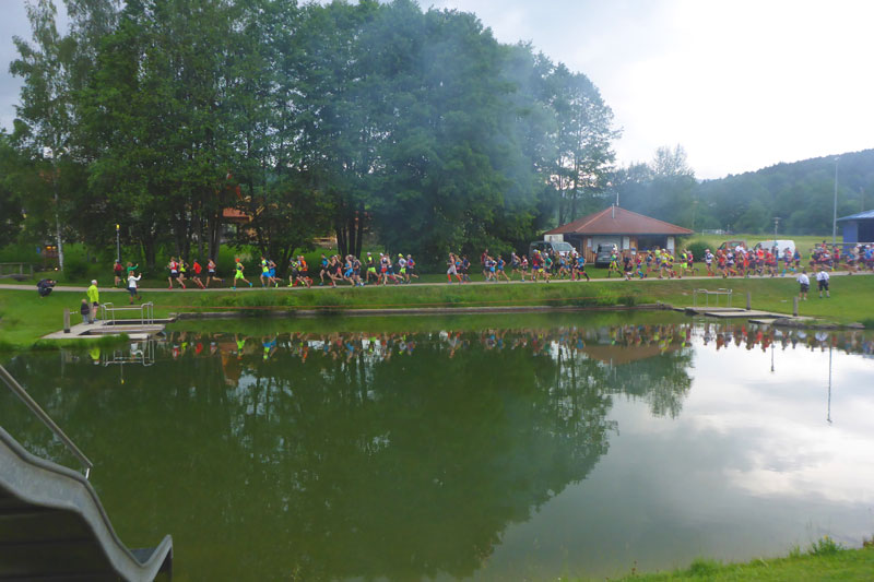 Auf der gegenüberliegenden Seite des Seeufers sind die Böllerschützen postiert. Um Punkt 8 Uhr steigt der Rauch auf und los geht´s. Die Thürnsteiner Blasmusik begleitet uns musikalisch auf der 400 Meter langen Ehrenrunde um den See. Imponierend anzusehen, wie schnell sich das Feld einige hundert Meter auseinanderzieht, obwohl hier noch gar nicht Vollgas gegeben darf, wenn ich mich recht entsinne. Wir laufen erstmal eine neutralisierte Runde mit Tempomacher voraus, bevor die Rennpferde richtig laufen dürfen.