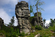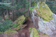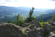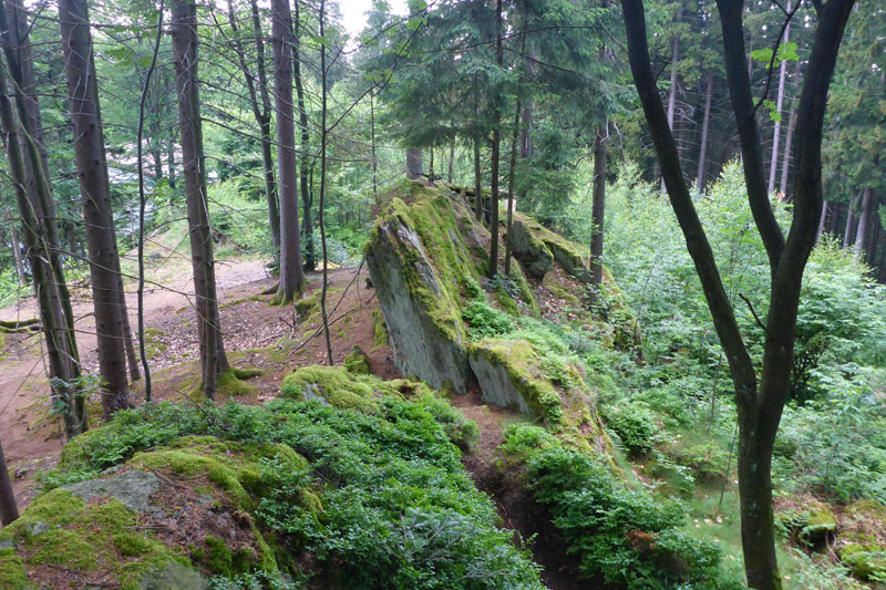 Ab Eck treffen wir auf den Goldsteig. Und der steht auch für eine spürbar anspruchsvollere, aber auch reizvollere Strecke mit viel Abwechslung. Bis zum Gipfel des Großen Arber könnten wir praktisch auf den nächsten 15 Kilometern auch den Markierungen des Premium-Wanderweges folgen. Zwölf Tausender stehen auf dem kompletten Kurs für uns heute auf dem Programm, bis zum „Kine“ sind es auf dem Goldsteig erst mal zehn. Als Gipfel ersichtlich sind dabei aber nicht alle. Der erste erkennbare ist der Ödriegel (1156 m), der Mühlriegel ist schon unbemerkt von mir durch. Von der markanten Felsformation des Ödriegel hat man einen ersten herrlichen Überblick.