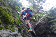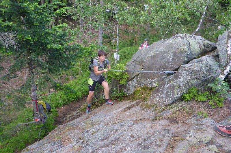 Über größtenteils wurzelige und felsige Trails geht es weiter, zwischendrin warten auch einige kleine Klettereinheiten auf uns. Vor dem Schwarzeck (1238 m) wird es wieder laut im Wald. Eine größere Gruppe Schlachtenbummler hat sich zwischen Felsen versammelt und macht mit Kuhglocken und lauten Anfeuerungsrufen einen Heidenlärm. Das schönste Gipfelkreuz auf unserer Tour ziert die Spitze des Schwarzecks, das polierte Metallkreuz ist wirklich eine Augenweide und glänzt in der Sonne. Heuer dürfen wir nicht – wie noch in den vorhergehenden Ausgaben – ganz hinauf. Etwas unterhalb ziehen wir vorbei.