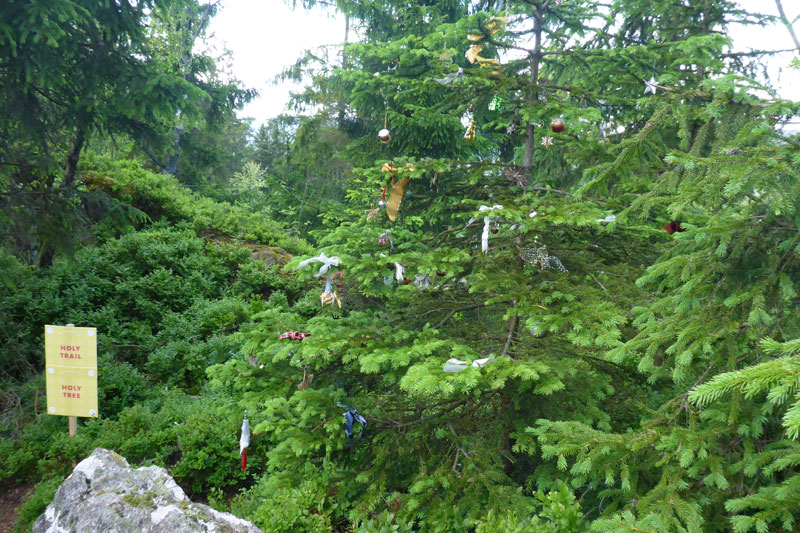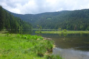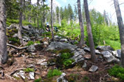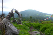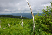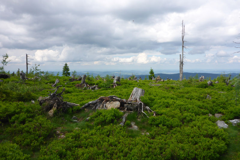 Mal auf mal ab geht es weiter. Ein Pfad führt uns aus dem Wald auf die Hochmoorfläche des Heugstatt (1261 m) und weiter zum Enzian (1285). „34,5 to go“ bedeuten, 20 km liegen hinter uns. Sämtliche Kilometertafeln weisen uns den noch vor uns liegenden Weg. Viele abgestorbene Baumreste, aber auch wieder jede Menge nachwachsender Fichten flankieren den Pfad auf dem Kammweg. Das Waldsterben ist auf dieser Hochfläche noch deutlich sichtbar. 1983 wurde vom Bayerischen Landwirtschafts- und Forstminister beschlossen, die damals durch einen Gewittersturm umgefallenen Fichten einfach liegenzulassen. Auch die in den Folgejahren sich ausbreitenden Borkenkäfer wurden in den Naturzonen nie bekämpft. Das konsequente Belassen der toten Fichten führte dazu, dass sich der Wald wieder natürlich verjüngen konnte. Vermoderndes Holz bietet die besten Voraussetzungen für das Keimen der nächsten Waldgeneration, wie man heute gut sehen kann. Die neue Fichtengeneration hat teilweise schon wieder eine beachtliche Höhe.