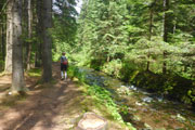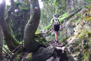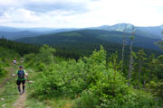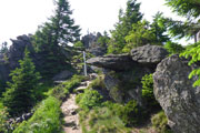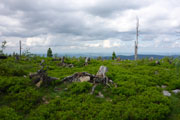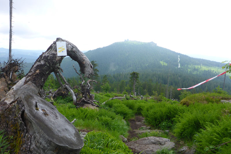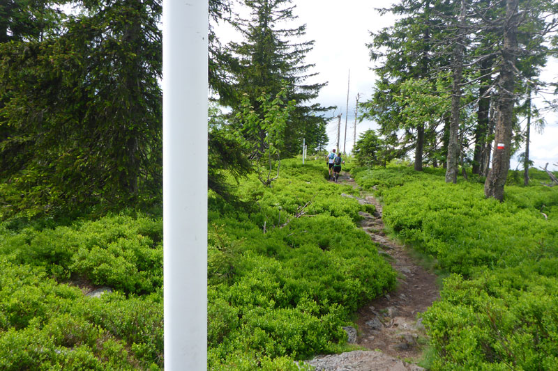 Ganz unerwartet, weil nicht angekündigt bekommen wir an einer kleinen Wasserstation Erfrischung angeboten. Der Abschnitt mit den jungen Fichten verschafft uns einen weiten Überblick über den Bayerwald. Ein steiler Aufstieg führt uns zum Gipfelkreuz des Kleinen Arber, das sich auf 1.350 m befindet. Gegenüber liegt bereits der Kine mit seinen beiden ehemaligen, kugelförmigen Abhöranlagen in Sichtweite, die zu Zeiten des kalten Krieges von der NATO installiert wurden. Steil und anspruchsvoll geht es über Wurzeln und Steine wieder runter bis zur Chamer Hütte. Auf dem „bequemen Weg“, wie mir ein Hinweisschild sagt, geht es erstmal noch ein Stück unterhalb, um den Gipfel herum.