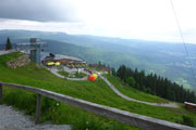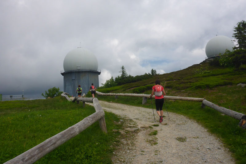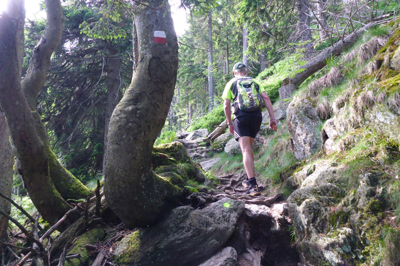 Nach 500 Meter Schotterpiste verlassen wir die Straße und biegen in die neue Streckenführung ein. In der Direttissima geht es, auf dem mit Holzbohlen abgestützten Hang, auf direktem Weg nach oben. Der Gipfel des Großen Arber liegt auf 1456 m. Nur ein einfaches Holzkreuz ziert seinen höchsten Punkt. Etwas unterhalb bei km 24,4 wartet die zweite Verpflegungsstelle direkt vor der Arberschutzhütte und der Eisensteiner Hüttn auf uns. Das Angebot ist riesig, aber ich muss schnell machen. Eine schwarze Wand nähert sich von Westen und es tröpfelt bereits. Ein gewichtiger Grund die Pause abzukürzen und mich vom Acker zu machen. Mit Andi mache ich mich auf den Weg, aber ich muss nochmal zurück, ich habe vergessen meine Flasche aufzufüllen und so schnell gibt es nichts mehr. Aber danach nix wie weg, bevor ich noch die Regenjacke auspacken muss.