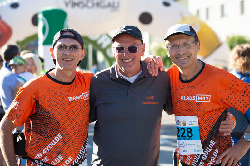 Wir haben noch etwas Zeit, unterdessen unterhält uns ein Moderatoren-Duo mit kurzen Starter-Interviews. Besonders erwähnt wird mit Manfred Haubenthal der älteste Teilnehmer. Geburtsjahr 1939. Respekt, Respekt. Der Spätzünder steht fast neben mir. Udo Jürgens hat es ja schon früher besungen: mit 66 Jahren fängt das Leben an. Für Manfred begann mit 66 erst seine Marathonkarriere. Untermalt wird alles lautstark und stimmungsvoll mit alten Rock-Klassikern. Das rockt gewaltig.