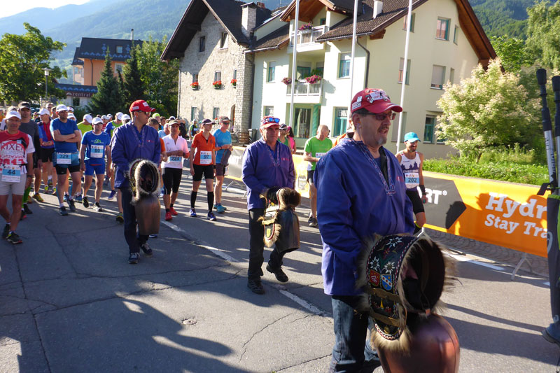 Eine vierköpfige Treichlergruppe aus dem benachbarten Val Münstair in der Schweiz läutet im wahrsten Sinne des Wortes die letzten Minuten bis zum Start des Marathons um 8 Uhr ein. Um 7.15 Uhr sind bereits die Wanderer auf die Strecke gegangen. Mario musste wegen erneuter Knieproblemen den Marathon sausen, wollte aber dennoch nicht ganz verzichten und wechselte kurzfristig zum Jochmarsch.