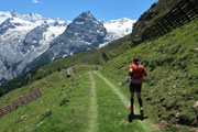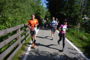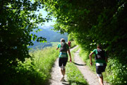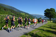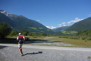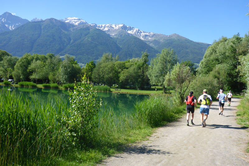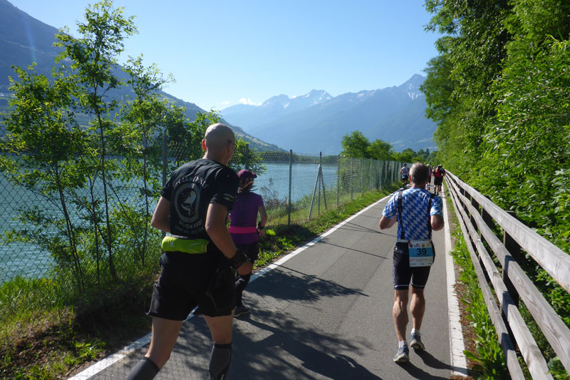 An der Etsch geht es für einige hundert Meter auf einem schmalen, links und rechts eingewachsenen Single-Trail entlang. Prompt stürzt ein Läufer den Böschungsrand hinunter. Aber nix passiert, wir helfen ihm auf die Beine und gleich geht’s weiter. Mir bereitet der Trail sofort viel Spaß, aber leider ist das Vergnügen nach 300 Metern bereits wieder beendet. Aber auch der Etschradweg Via Claudia Augusta ist sehr schön zu laufen und meist auch wunderbar schattig. Er führt uns wieder auf Asphalt, zurück Richtung Prad. In der Antike war die Via Claudia Augusta eine der wichtigsten Römerstraßen, die Norditalien mit dem süddeutschen Raum verband und über den Reschenpass und meine Heimatstadt Augsburg an die Donau führte.