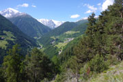 Mit etwa 15 Minuten Verspätung geht es endlich los. Über die Suldenbachbrücke verlassen wir Prad. Ein schmaler asphaltierter Radweg führt uns über Agums nach Lichtenberg. Bereits nach 2,5 Kilometer steht hier die erste Wasserstelle. Da es schon ordentlich warm ist, ist frühes nachzutanken sehr empfehlenswert. Nach Lichtenberg gibt es auch die ersten langgezogenen Wellen mit ein paar Höhenmetern. Die Talschleife weist etwa 100 Höhenmeter auf, die merkt man mehr, als ich mir gedacht hätte. Wir verlassen den geteerten Weg und wechseln auf Naturboden. Damit hatte ich erst recht nicht gerechnet. Wellig geht es so einige Kilometer dahin.