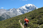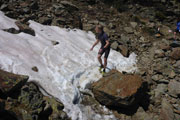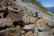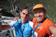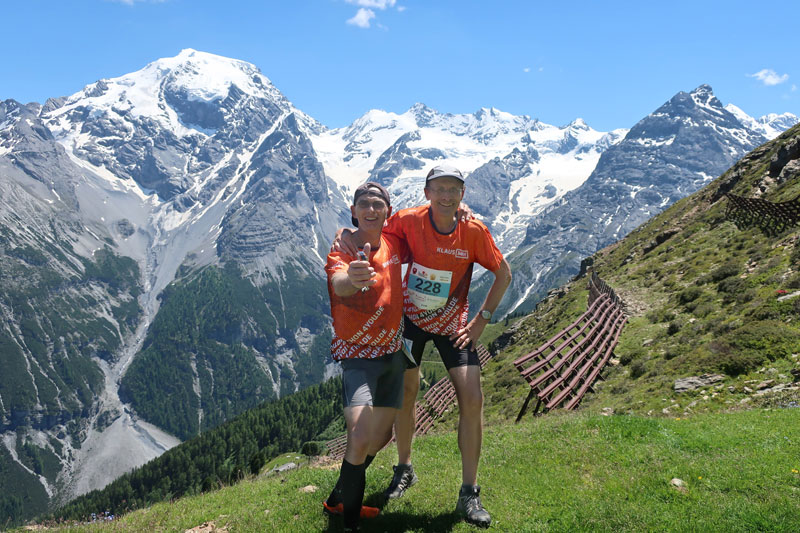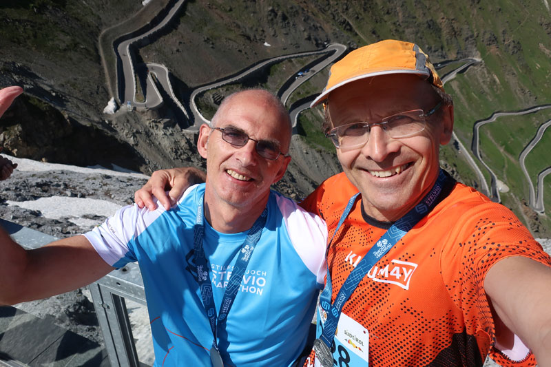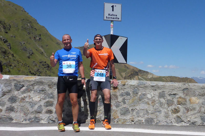 Neben dem Marathon gibt es noch die 26 km lange Classic-Strecke, hier entfällt die Schleife im Flachen. Zudem kann sie auch als Jochmarsch ohne Zeitmessung gewandert werden. Die Short-Distanz beginnt ab Kehre 46 der legendären Passstraße und ist 14 km lang. Stöcke sind für alle drei Laufstrecken verboten. Lediglich Wanderer dürfen bewaffnet sein. Schwierig macht die Dreiteilung der Strecke für Klaus und mich auch die richtige Wahl der Besohlung zu treffen. Etwa die Hälfte dürfte auf Asphalt zurückzulegen sein, der Rest auf Naturstrecken bis zu alpinen Verhältnissen. Während sich Klaus für Trailschuhe entscheidet, wähle ich die Straßenschlappen. Mal sehen, wer es besser trifft.