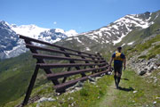 Nach einer weiteren VP an den Prader Fischweihern verlassen wir die Etsch und nehmen groben Blickkontakt mit unserem primären Ziel auf. Die schneebedeckten Eis- und Felsformationen rund um das Stilfserjoch mit der Ortlerspitze liegen kurzzeitig genau in unserem Visier, darauf weist uns ein großes Banner hin. Die Passhöhe selbst kann man von hier aber noch nicht auszumachen. Ein Steg führt uns über den Suldenbach und wir sind zurück in Prad. Etwa 100 Meter entfernt von unseren Startplatz queren wir die Straße. Kurz darauf ist unsere knapp 16 km lange Schleife durch die Talsohle des Vinschgau beendet. Laut Ausschreibung ist hier ein Zeitlimit von zwei Stunden einzuhalten. Ob das so genau kontrolliert wird, kann ich nicht sagen. Eine Zeitmessmatte gibt es jedenfalls nicht zu passieren und Kontrolleure sind auch nicht zu sehen. So oder so, das sollte jeder schaffen.