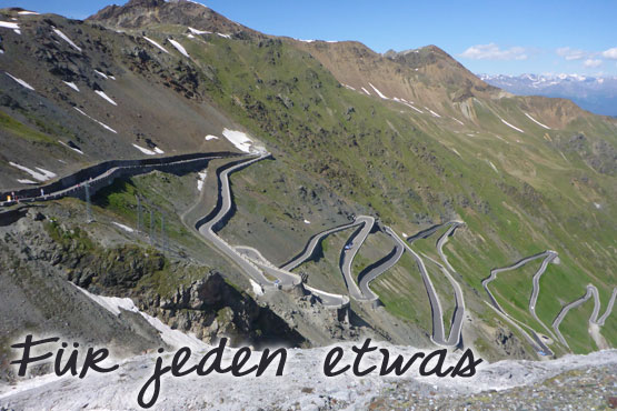 Mit ihren vielen Spitzkehren und der großartigen Aussicht ist die Passstraße heutzutage besonders bei Motorradfahrern und Radlern sehr beliebt. Befahren werden kann der Pass aber nur im Sommer, von November bis Juni herrscht Wintersperre. Mit einer Höhe von 2.757 m ist das Stilfserjoch der höchste Gebirgspass in Italien und der zweithöchste der Alpen. Gesperrt ist er ausnahmsweise auch diesen Samstag von 8.30 – 18.00 Uhr extra für den Stilfserjoch Stelvio Marathon. Eine Ausnahme gilt für Radler, auf sie müssen wir aufpassen, sie dürfen auch während des Rennens auf der Passstraße fahren.