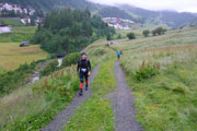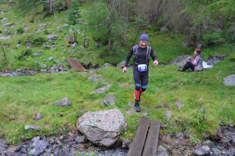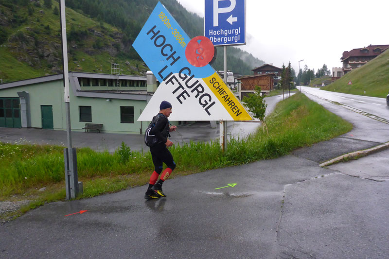 Vor dem Einlass in den Startbereich wird stichpunktartig die Pflichtausrüstung kontrolliert. Ich muss nichts mehr auspacken, bin ja gut eingepackt. Ein Liter Flüssigkeit ist noch vorgeschrieben, dazu ein eigener Becher, es werden keine an den VPs ausgeteilt. Um 7 Uhr wird pünktlich gestartet. Wenigstens der Regen hat wieder nachgelassen. Wie mittlerweile schon gewohnt, setzt sich das Hauptfeld fluchtartig in Bewegung und nur ein paar wenige lassen es langsamer angehen. Die ersten fünf Kilometer führen mit ein paar Wellen garniert leicht Talabwärts an der Gurgler Ache entlang. Ein paar hundert Meter sind dabei auch auf Asphalt auf dem Seitenstreifen der Gurgler Straße dabei.