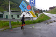Zum Einlaufen für „höhere Aufgaben“ ist das ideal. Wir sind jetzt schön im Rhythmus, es geht rein in den Tunnel. Werden aber jäh gestoppt, wir sind an der Abzweigung vorbei gedonnert. Glücklicherweise steht in dieser Straßenüberbauung ein Posten und schickt uns wieder zurück. Vor dem Eingang geht es links ab und nach oben, hier beginnt der erste richtige Aufstieg, der auf den nächsten 3 Kilometern über 500 Höhenmeter beinhaltet und uns vorerst mal auf 2.500 Meter Höhe führt. Viel weiter runter kommen wir auf den nachfolgenden 30 km dann nicht mehr. Noch ist zu Beginn die gegenüberliegende Talseite zu sehen, aber die tiefliegende Wolkendecke beunruhigt mich doch stark.