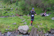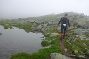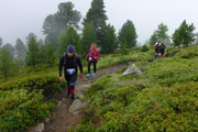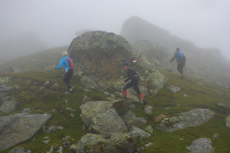 Die erste VP mit Getränken erreichen wir nach 6,5 km. Zwei Besenläufer, ohne Besen wie sie betonen, können bei einer kurzen Pause auf uns aufschließen. Das erste Zeitlimit beträgt hier 1:30 Stunden. Unsere kleine Nachzüglergruppe ist derzeit aber nicht gefährdet, wir liegen noch weit vor dem Cut und müssen auch nicht unser Tempo erhöhen. Auf schmalen Pfaden geht es in Serpentinen steil nach oben. Je höher wir kommen, umso diffuser wird die Sicht. Nach überschreiten der Waldgrenze wird es felsig. Im Nebel geht es lange Zeit über ein verblocktes Feld.