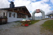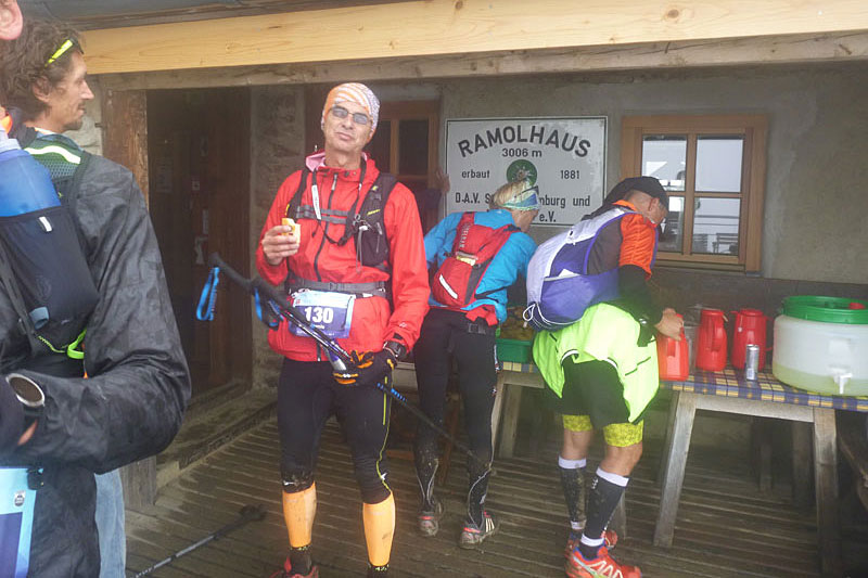 Das Ramolhaus markiert in etwa die Hälfte der Marathonstrecke und auch die höchste Stelle des Kurses. Es ist das „höchste Haus Hamburgs" auf 3.006 m. Die klassische Schutzhütte, die bis zu 52 Personen Platz bietet gehört der Sektion Hamburg des Deutschen Alpenvereins. Zu sehen gibt’s leider immer noch nix. Der Verpflegungstisch steht vor dem Haus und ist üppig ausgestattet mit u. a. heißem Tee und Kuchen. Wir können aber auch reingehen, etwas rasten und uns aufwärmen. Das Zeitlimit an der Hütte liegt bei 6:30 Stunden. Ich bin eine Stunde darunter, da sollte heute nichts schiefgehen.